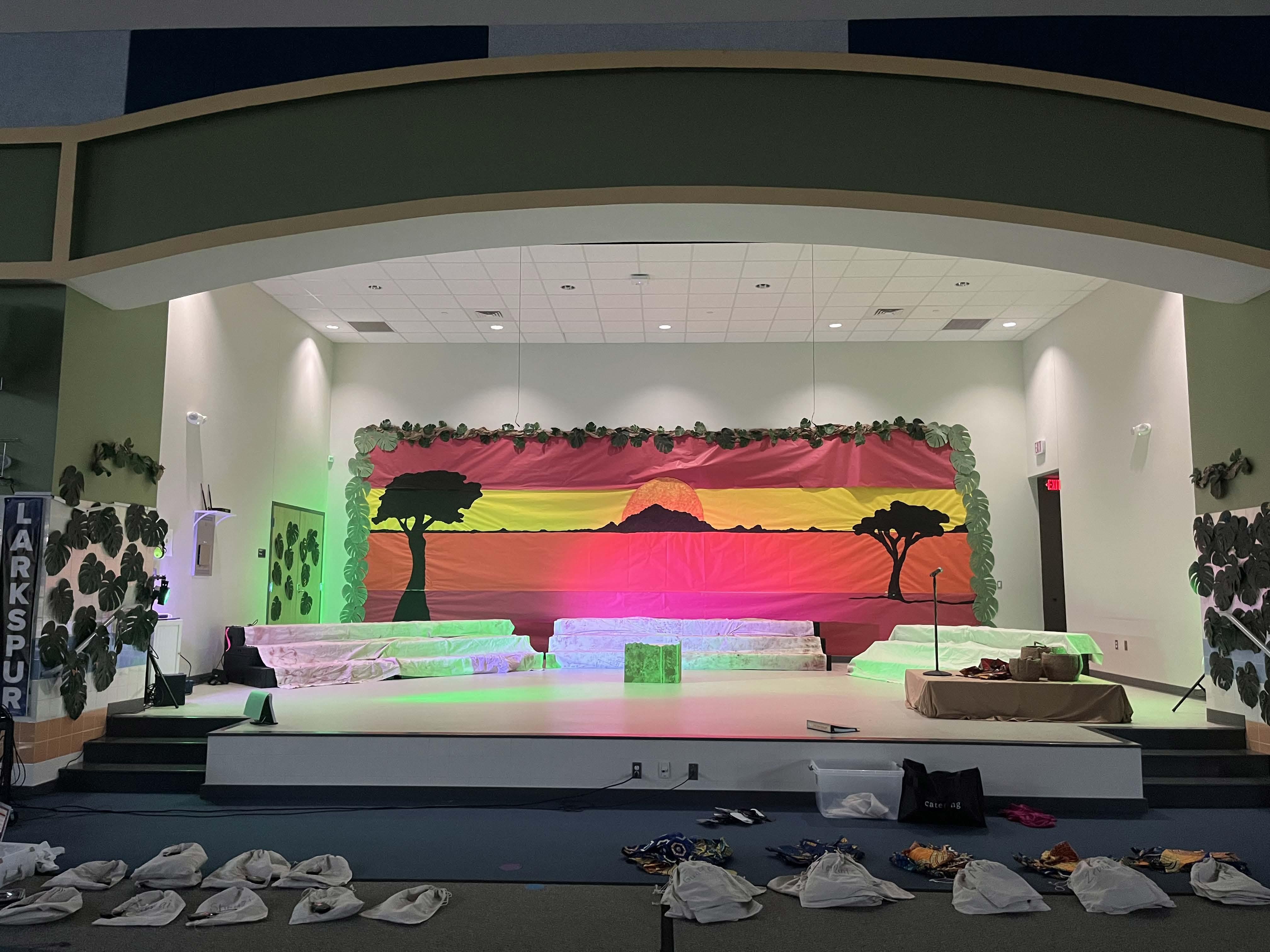In December, students auditioned for their Lion King roles. In January, students assigned principal roles began rehearsals in the classroom with Mrs. Areias. They met for 5 Monday rehearsals. The chorus joined in for the last 5 rehearsals along with our fantastic student teacher/ assistant director, Layla Villarreal Hernandez. We also moved rehearsals to the stage at that time. So in all, our students only spent 10 Mondays working on the show. They were responsible for learning their lines and lyrics at home so they were ready to go in class. We also had a group of technical students that were led by our amazing Art Teacher, Kellie Bruce. They created all the technical aspects you are seeing tonight. They painted the rocks, created the backdrop, the leaves, the costumes, the animal ears, drums, fire torches, etc… This show with a little guidance from our team is student generated. They have done such an amazing job and learned so many aspects of production throughout the journey. We hope you enjoy this story in the great African Savanna.