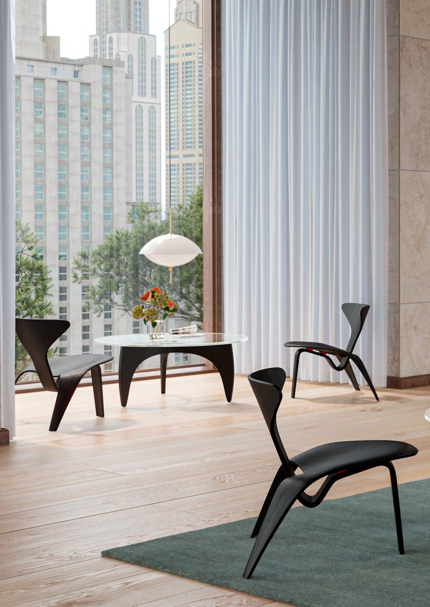 Built on danish design tradition. Modern lounge chairs elevate seating to an art form. The design contains no straight lines, making it look organic and soft despite its simplicity and strong architectural appeal.