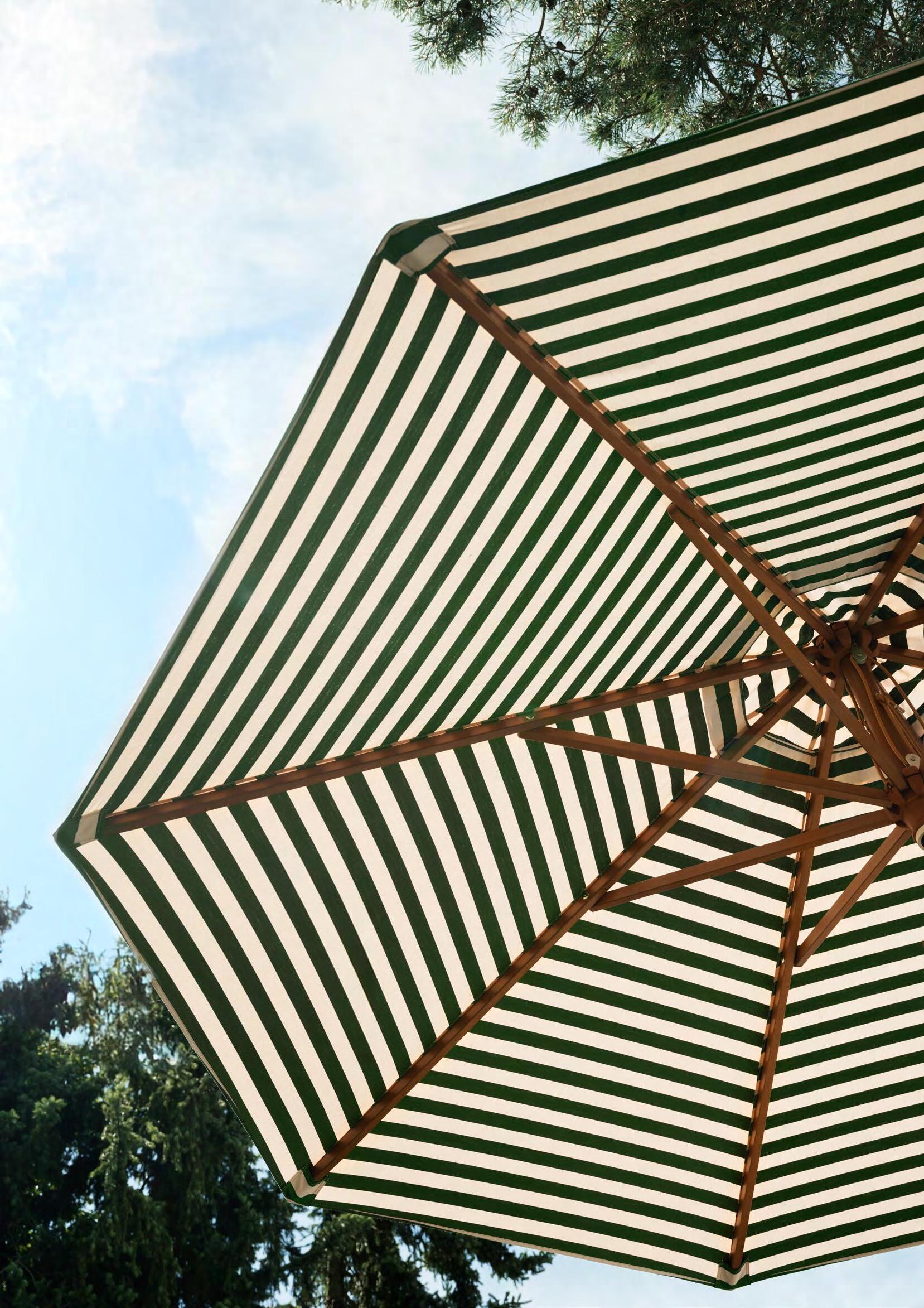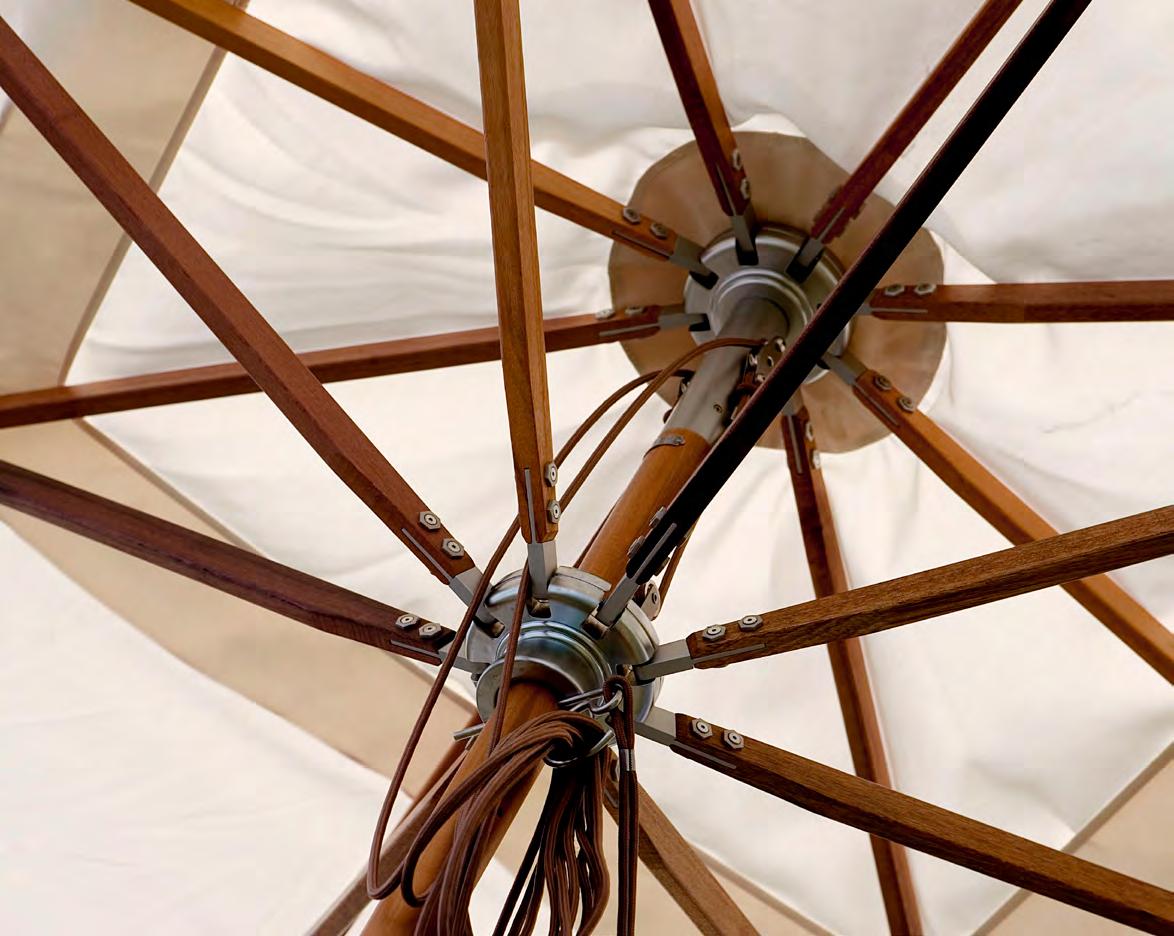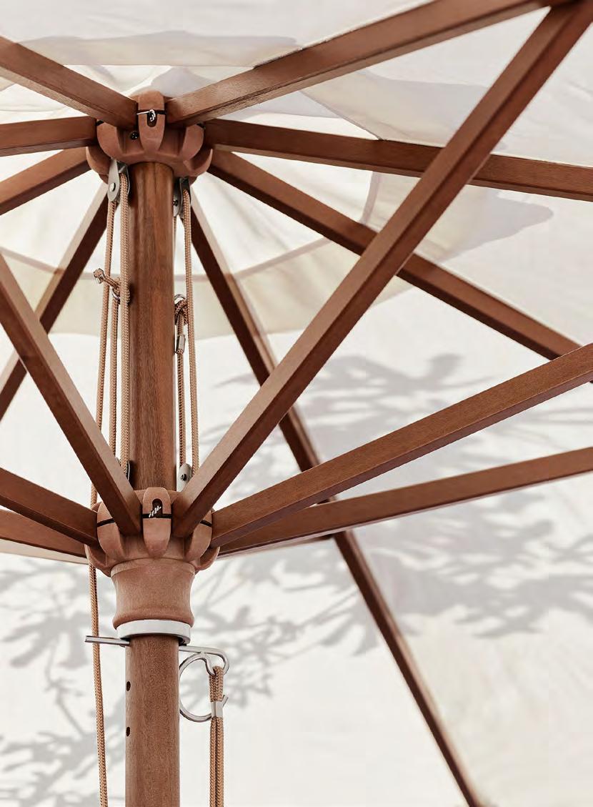 A leather-reinforced textile adds strength, while an aluminium-reinforced pole protects the wood from wear and scratches. The double-pulley system makes opening and closing the Atlantis umbrella series easy.