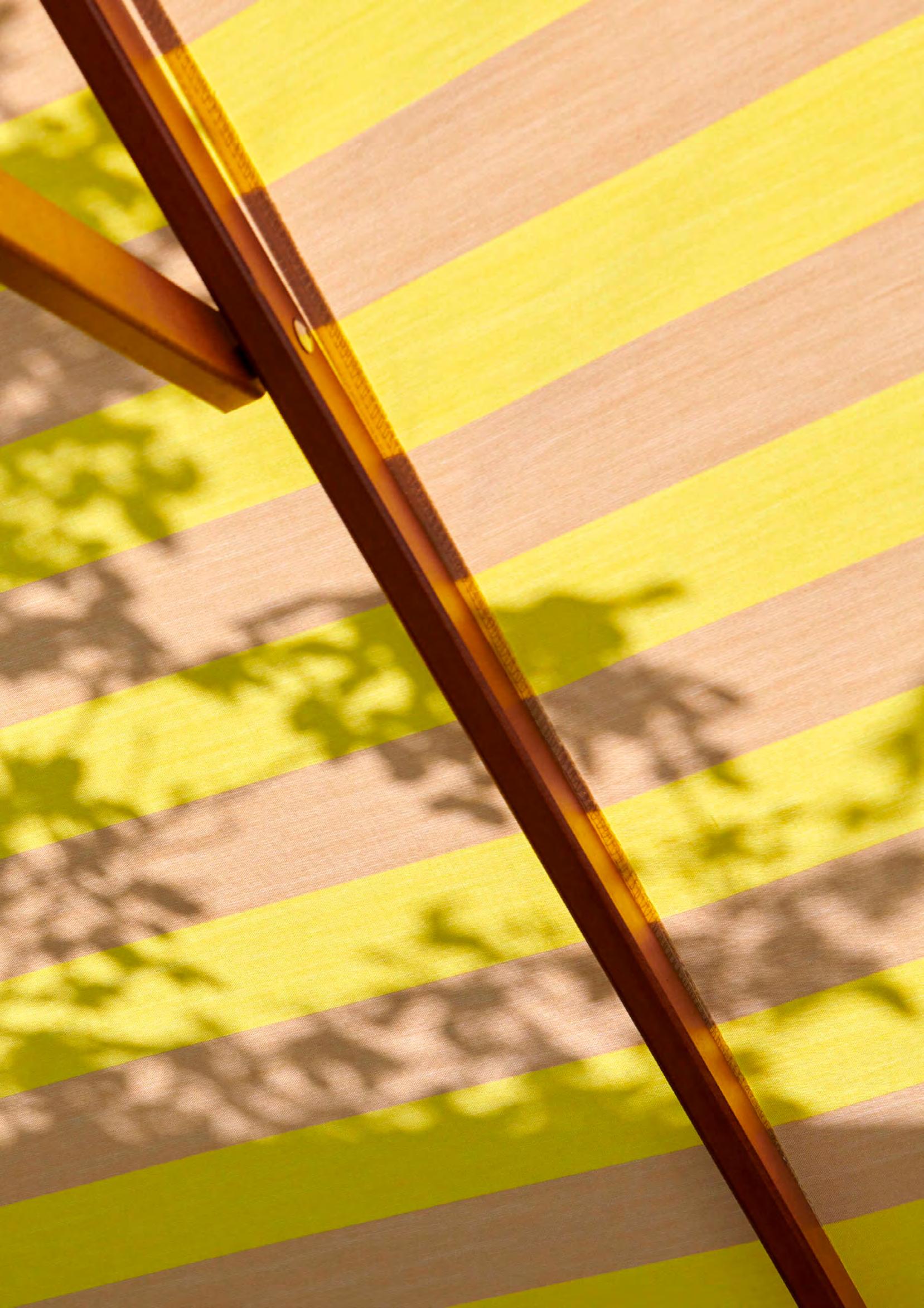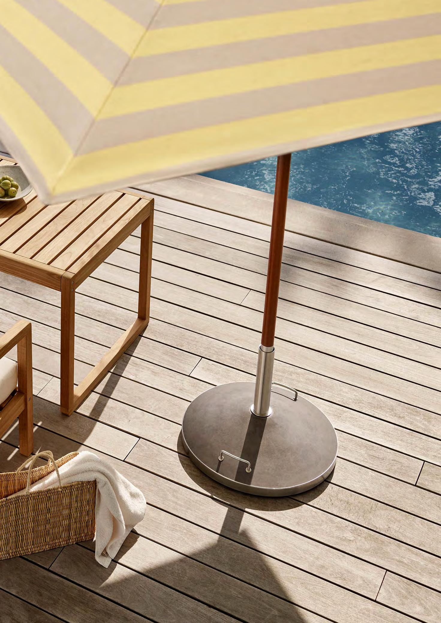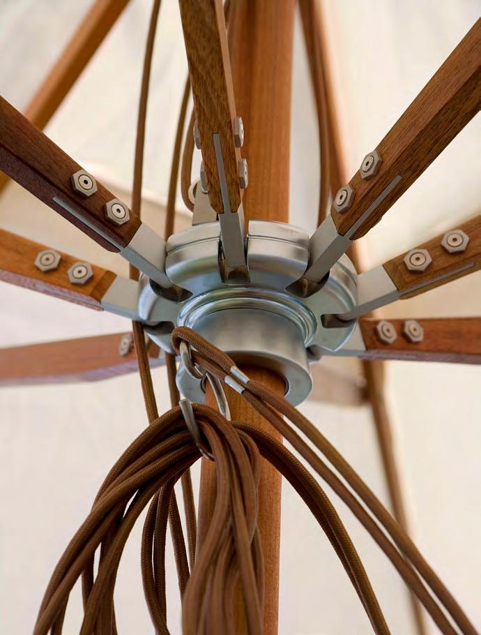 A leather-reinforced textile adds strength, while an aluminium-reinforced pole protects the wood from wear and scratches. The double-pulley system makes opening and closing the Atlantis umbrella series easy.