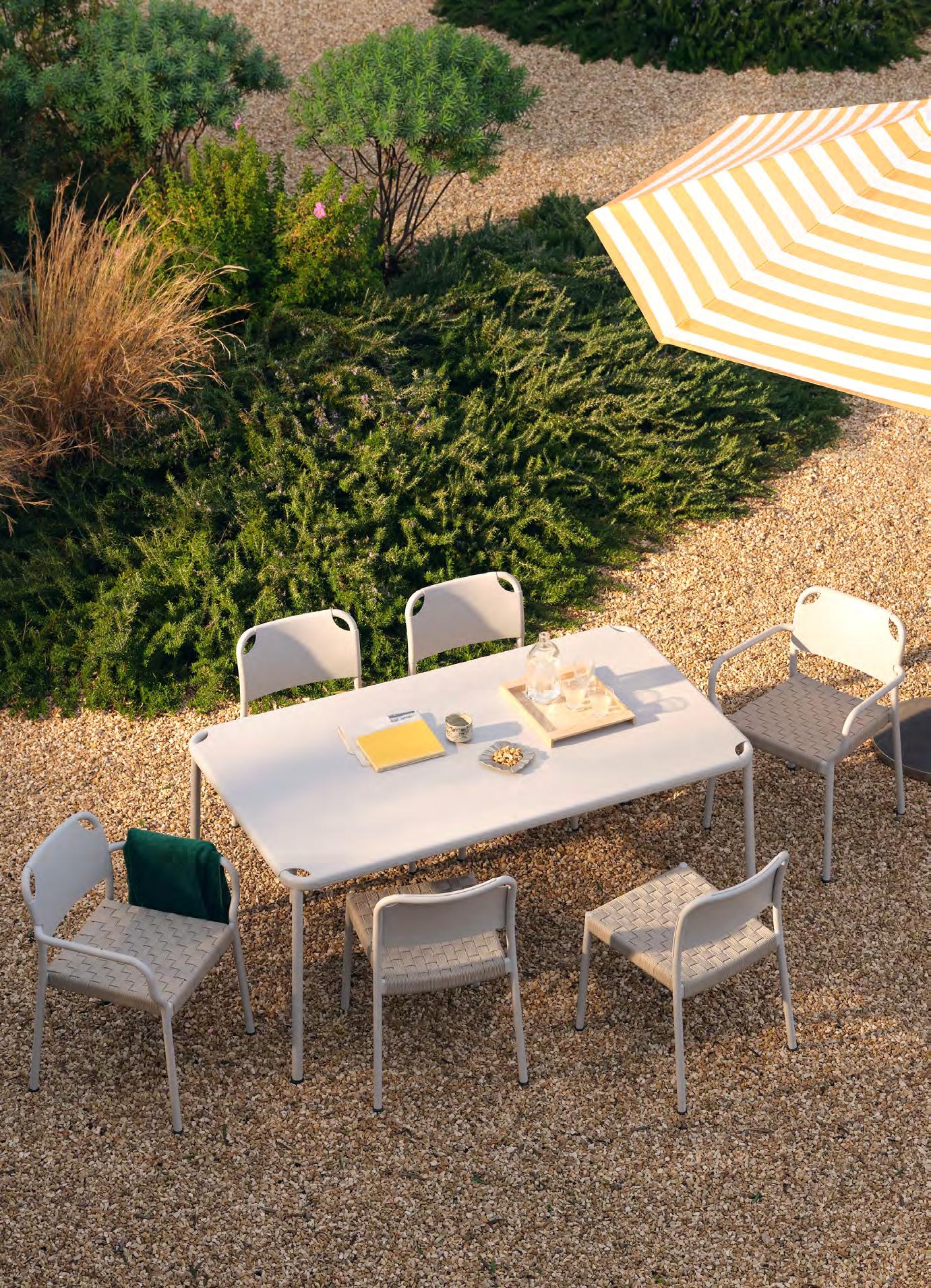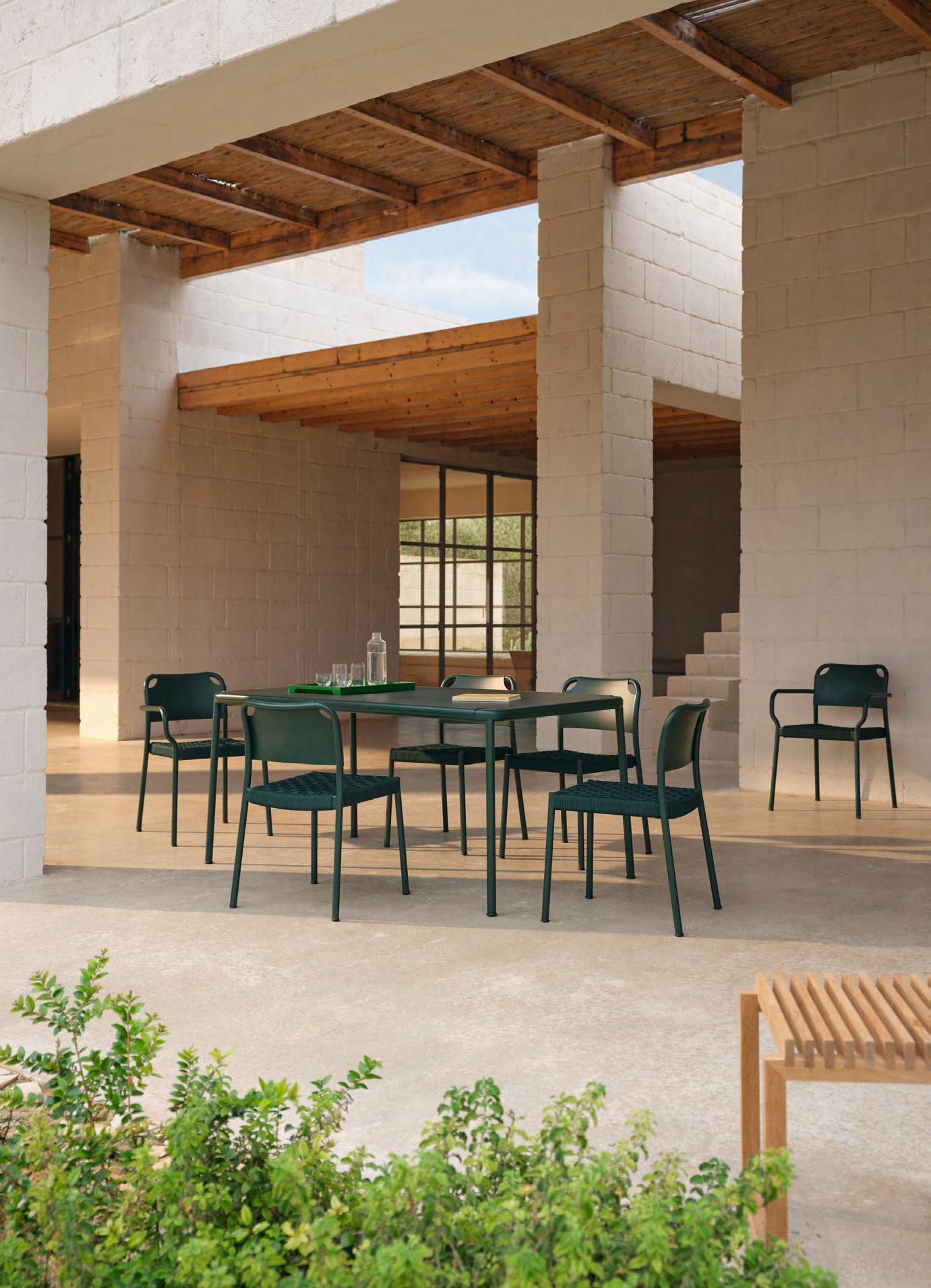 Aluminium is used in several of our outdoor furniture series for its strength, light weight, and resistance to corrosion. The material performs reliably outdoors and can be recycled.