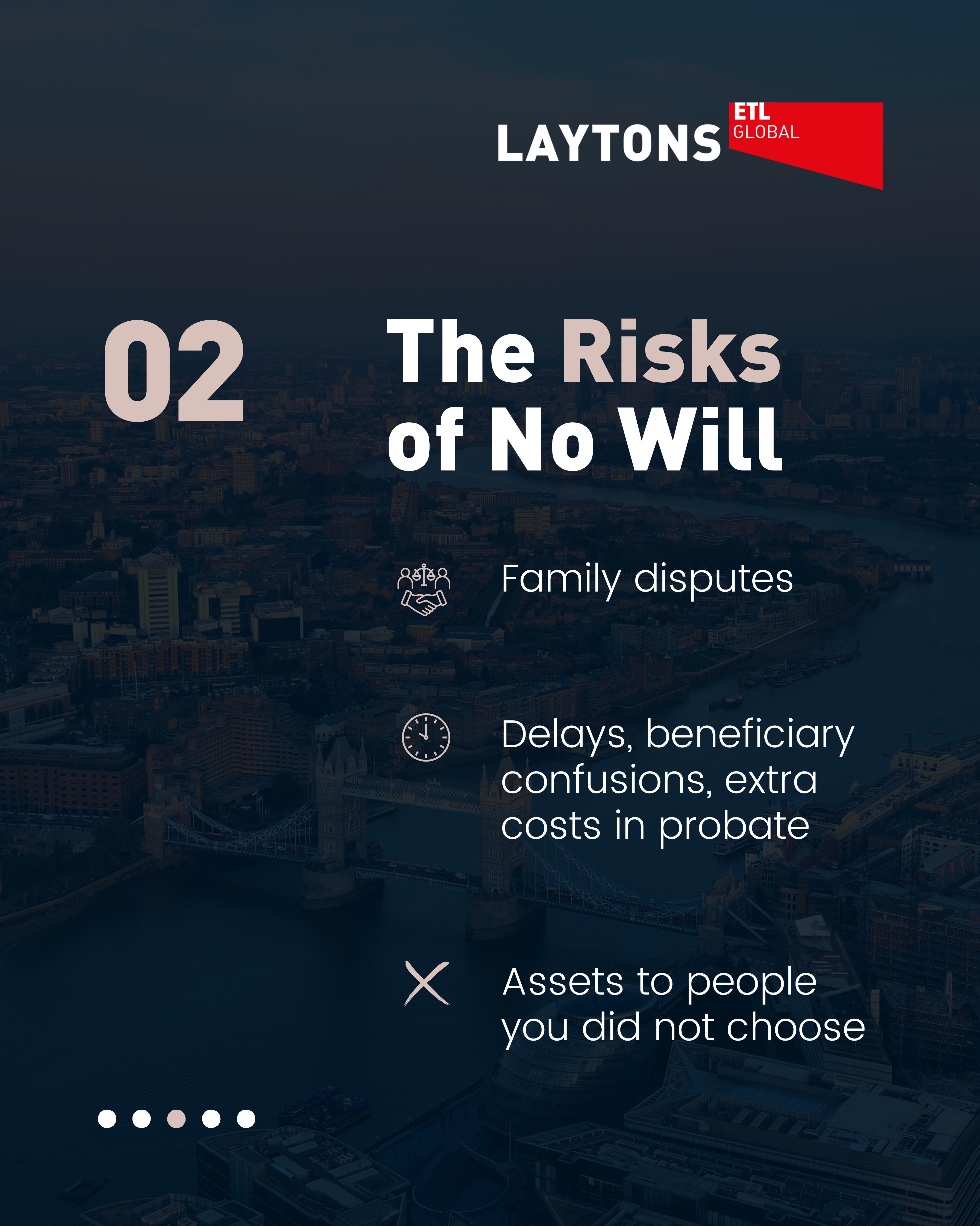 When there’s no will, the law decides who inherits your estate, and the outcome may not reflect your wishes. This can lead to delays, confusion, family disputes, and additional costs for those you leave behind.