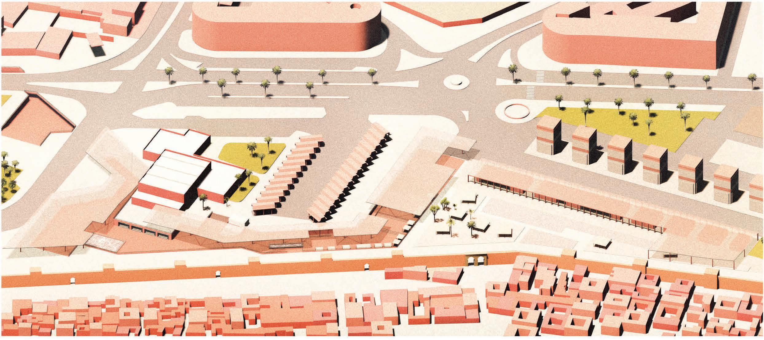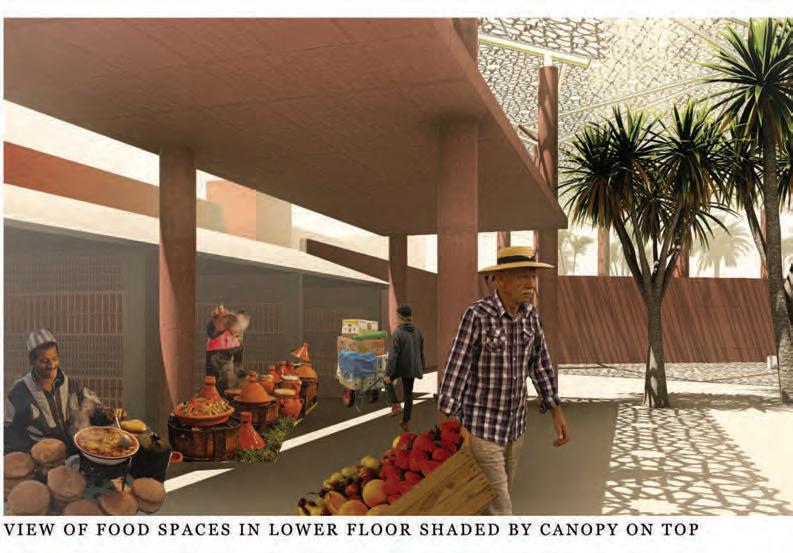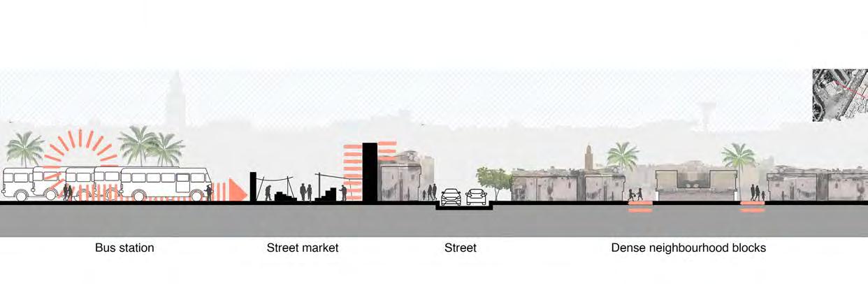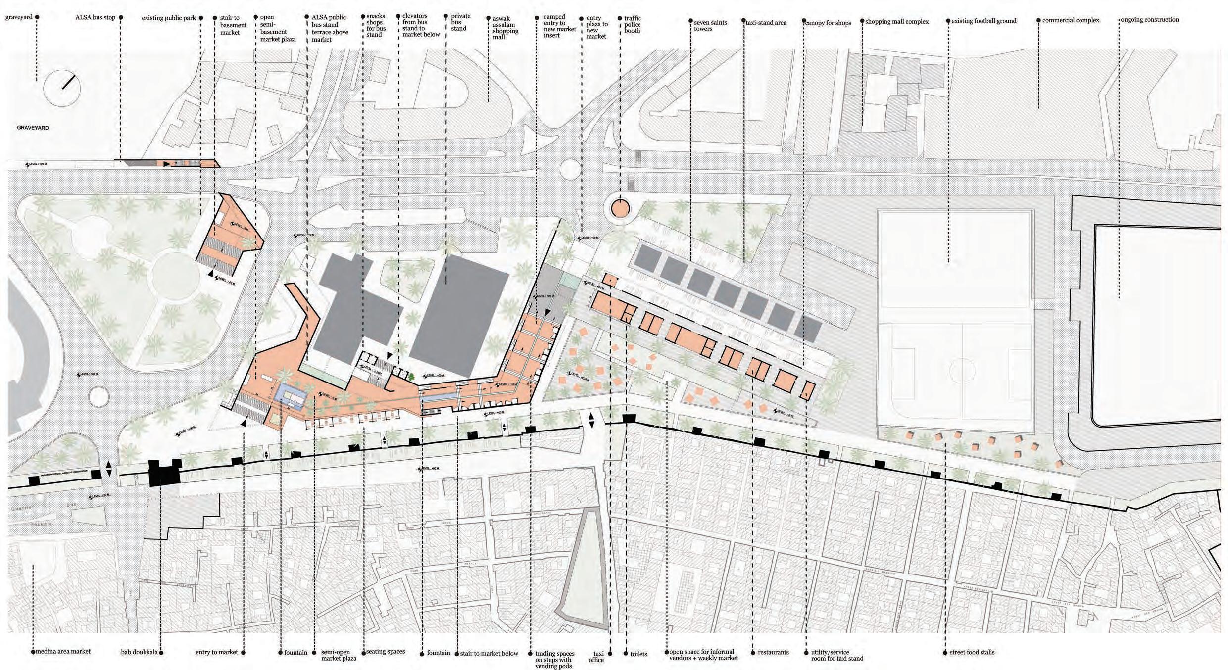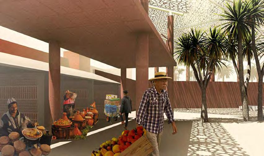 This research and urban design project strategies to create a sustainable network of food producers, processors and consumers in Marrakech by making the food sellers the pivotal user type being catered to. The in-between urban space near Bab Doukkala bus stand has been designed as a polyfunctional, versatile, adaptive market space that absorbs the high fux of restaurant owners, street food stalls, informal fruit vegetable vendors and minor food sellers. The urban design insert functions in sync with the transportation networks around and also tries to grow incrementally adapting to the precarious site conditions. The wall of Medina stands as a backdrop to the new urban architecture that creates a safe food oasis among one of the busiest urban locations of Marrakech.