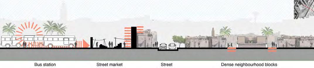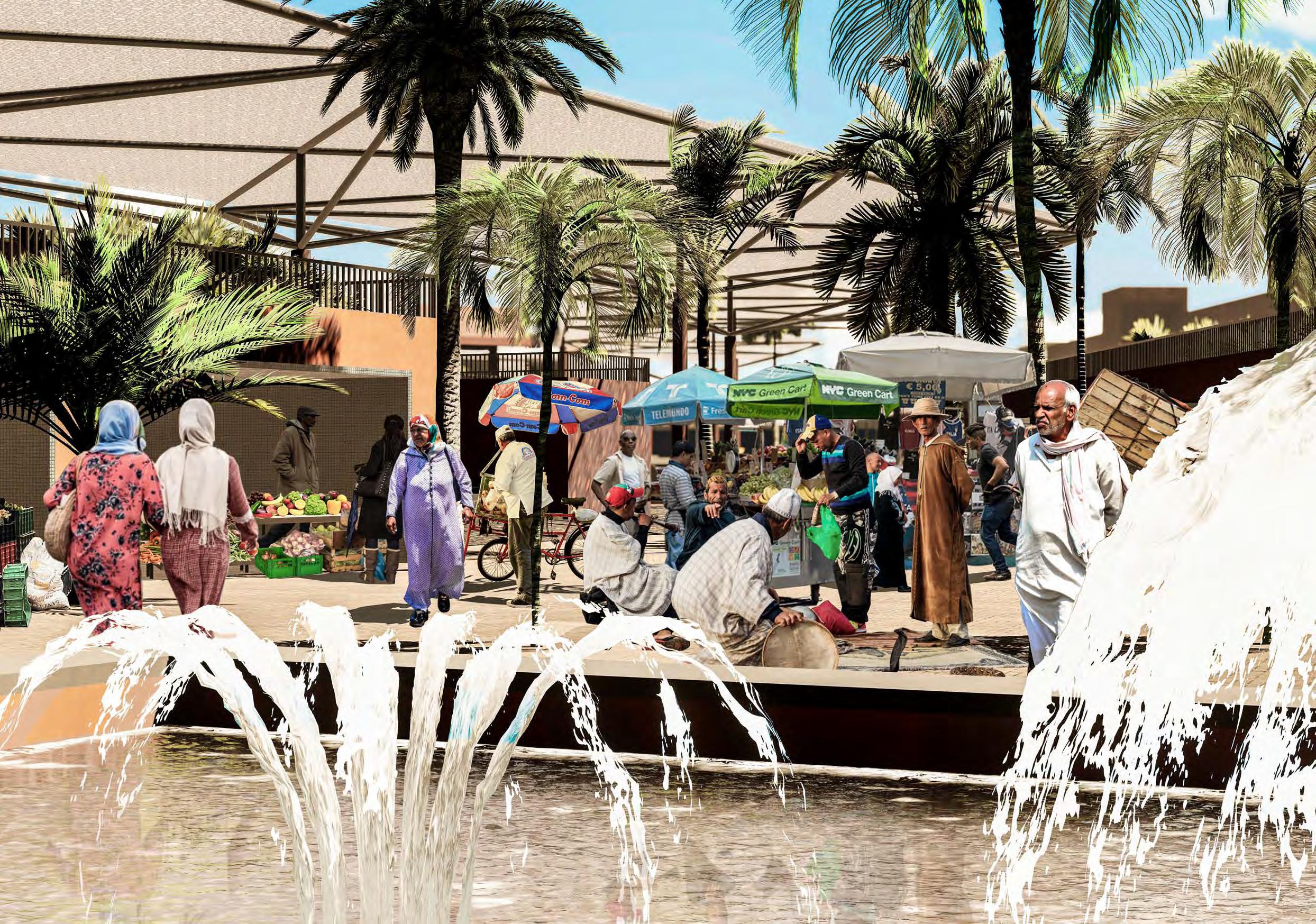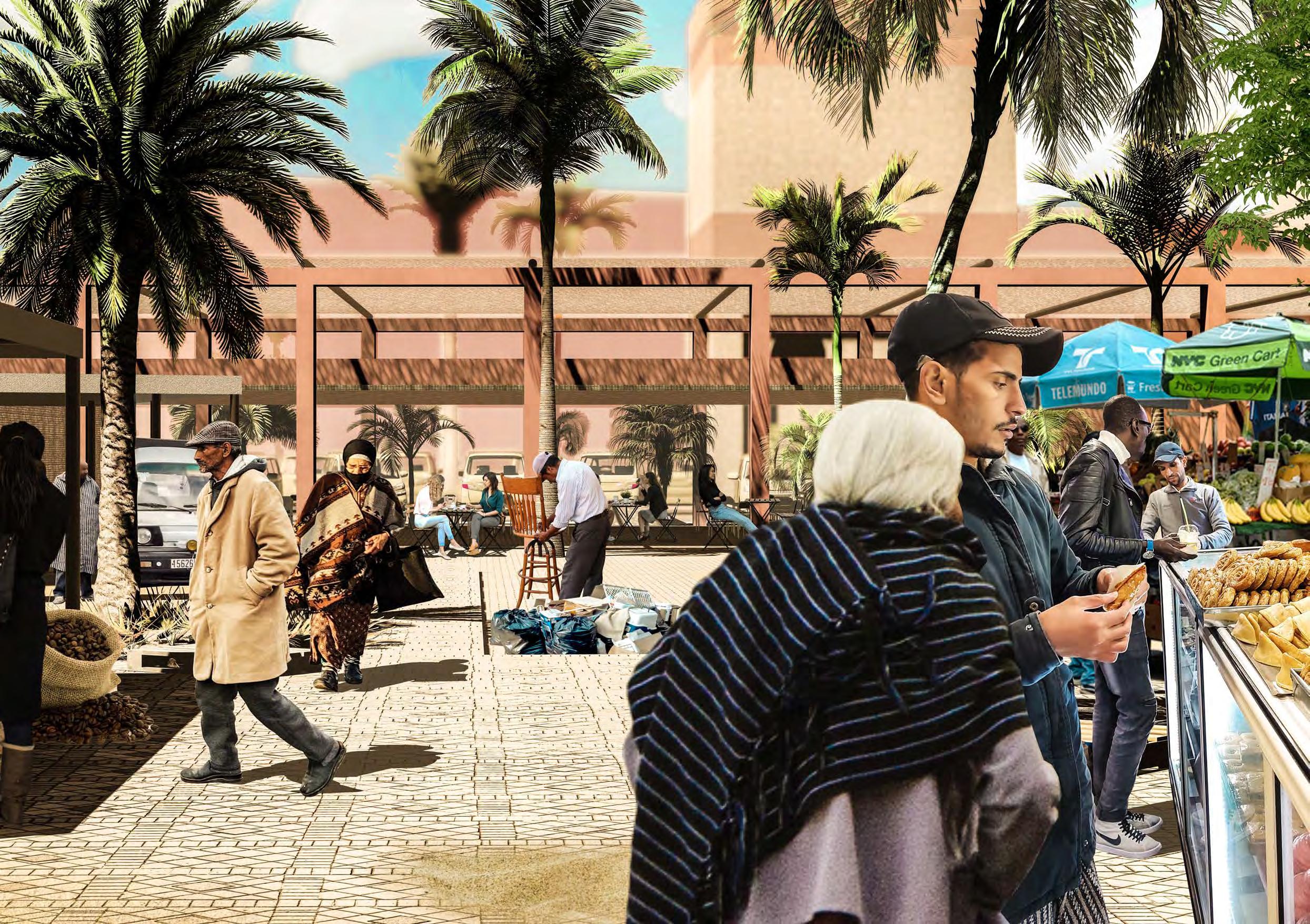 This research and urban design project strategies to create a sustainable network of food producers, processors and consumers in Marrakech by making the food sellers the pivotal user type being catered to. The in-between urban space near Bab Doukkala bus stand has been designed as a polyfunctional, versatile, adaptive market space that absorbs the high fux of restaurant owners, street food stalls, informal fruit vegetable vendors and minor food sellers. The urban design insert functions in sync with the transportation networks around and also tries to grow incrementally adapting to the precarious site conditions. The wall of Medina stands as a backdrop to the new urban architecture that creates a safe food oasis among one of the busiest urban locations of Marrakech.