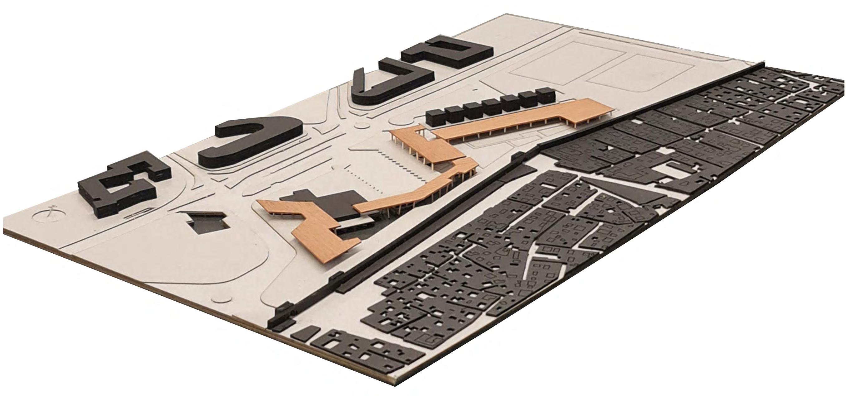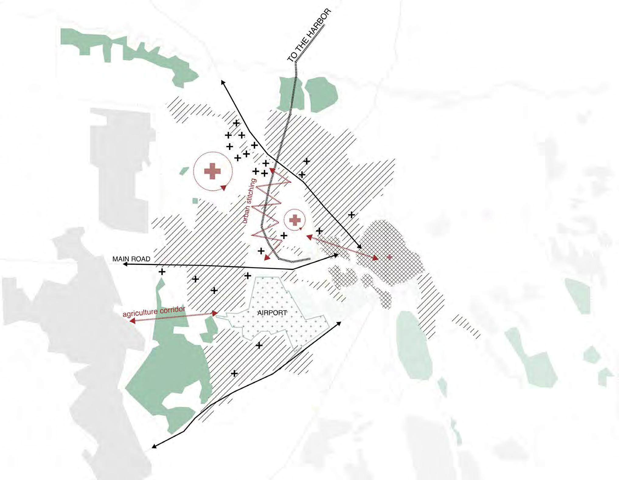 ADAPTIVE DESIGN: Getting the borders of the new parcel defned We make sure that becuase the bus station is not going to be there forever, to give enough space for manouvering for whatever other public building comes there on that parcel. Managing the space in time gives possibilities for further development and articulation.