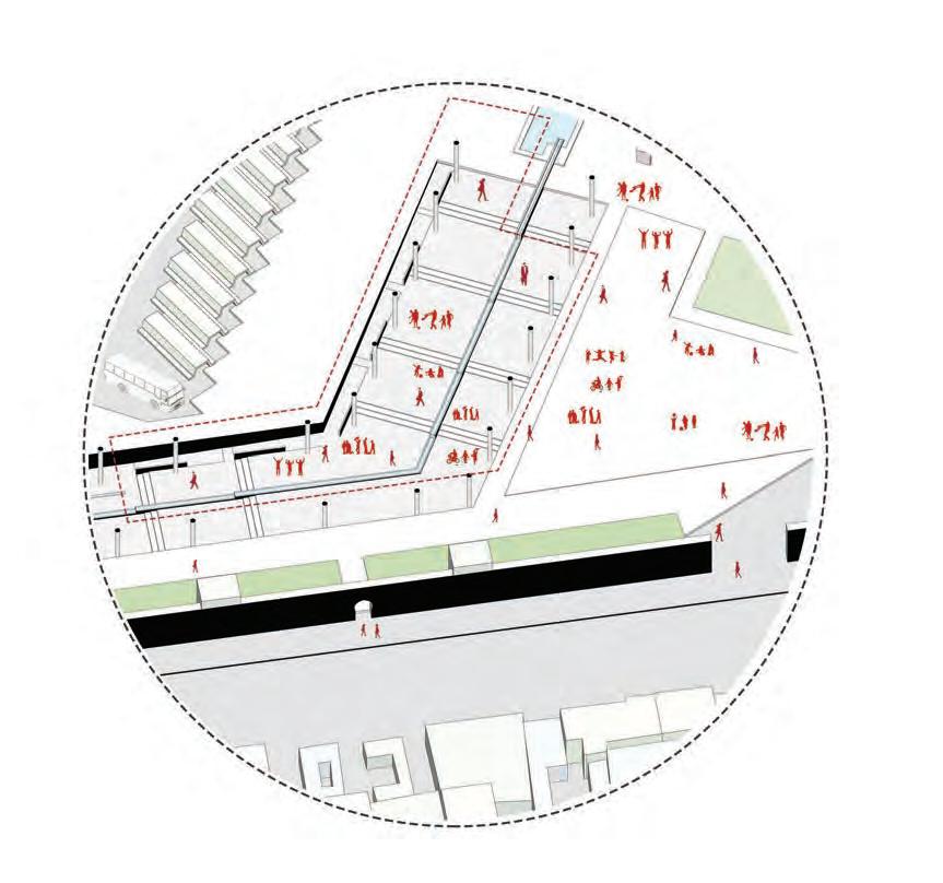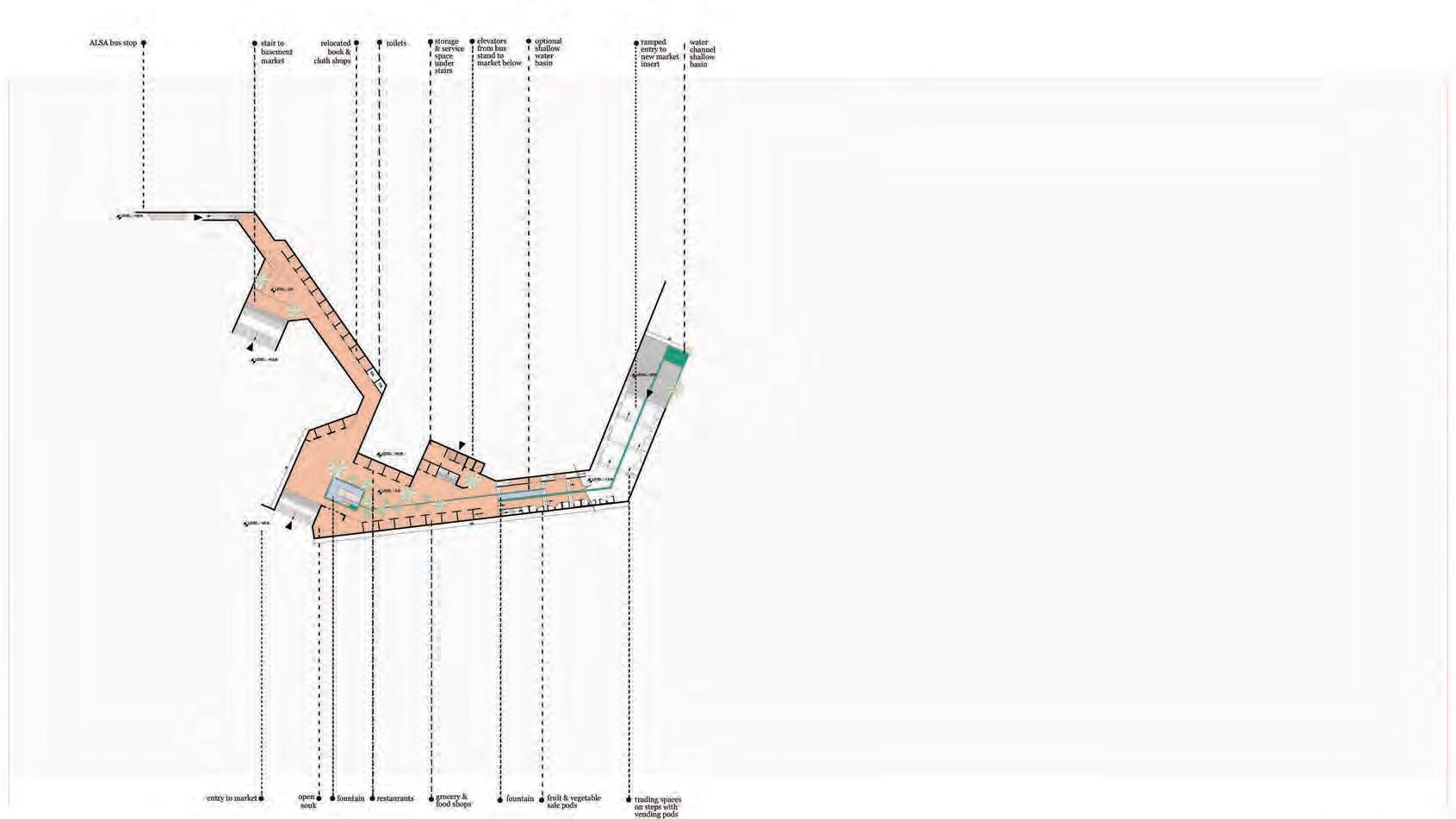 BARRIER FREE ACESS: As a third intervention we have worked out on vertical travel of people in an unconscious sense by providing cascading steps and introducing new functions like fruit and vegetable shops which was already existing the same location and has been articulated and relocated in new design.