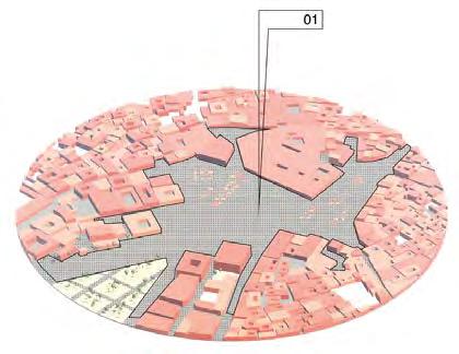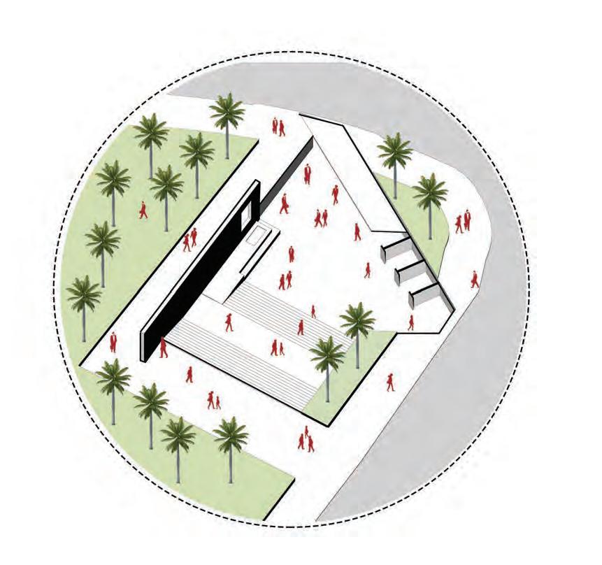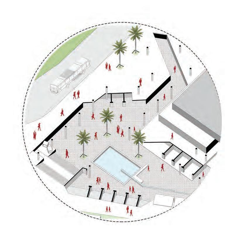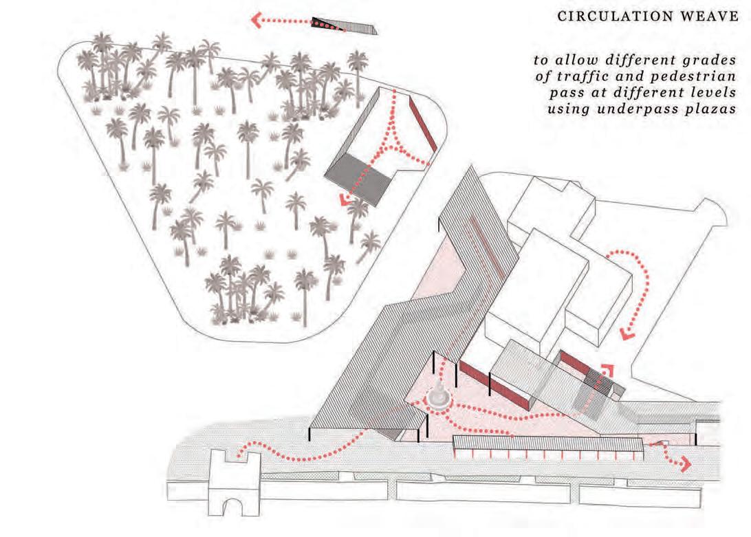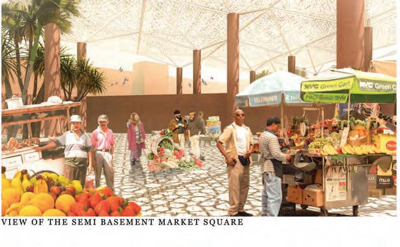 The architectural infrastructural element of tunnel, underpass , staircase was used to create a semi basement to link the diferent grades of trafc and pedestrian fow in and around the site. While having a architectural preservation strategy of protecting the Seven Saints towers, the access to the taxi stand was refned and organized using street networks and level diference. In order to facilitate shading in the hot arid climate of Marrakech, large canopy with overhangs was used to protect from Sun and Rain . At the same time it will provide an open airy volume for marketplace activity . The Barrier Free design was facilitated by the large cascading steps in the central portion of the site along with a ramp that leads people to the semi basement without a sharp level drop cognition . The landscape feature in the semi basement allow for passive cooling using fountains and optional water channels that have been inspired from the traditional Islamic fountains and water basins of Marrakech.