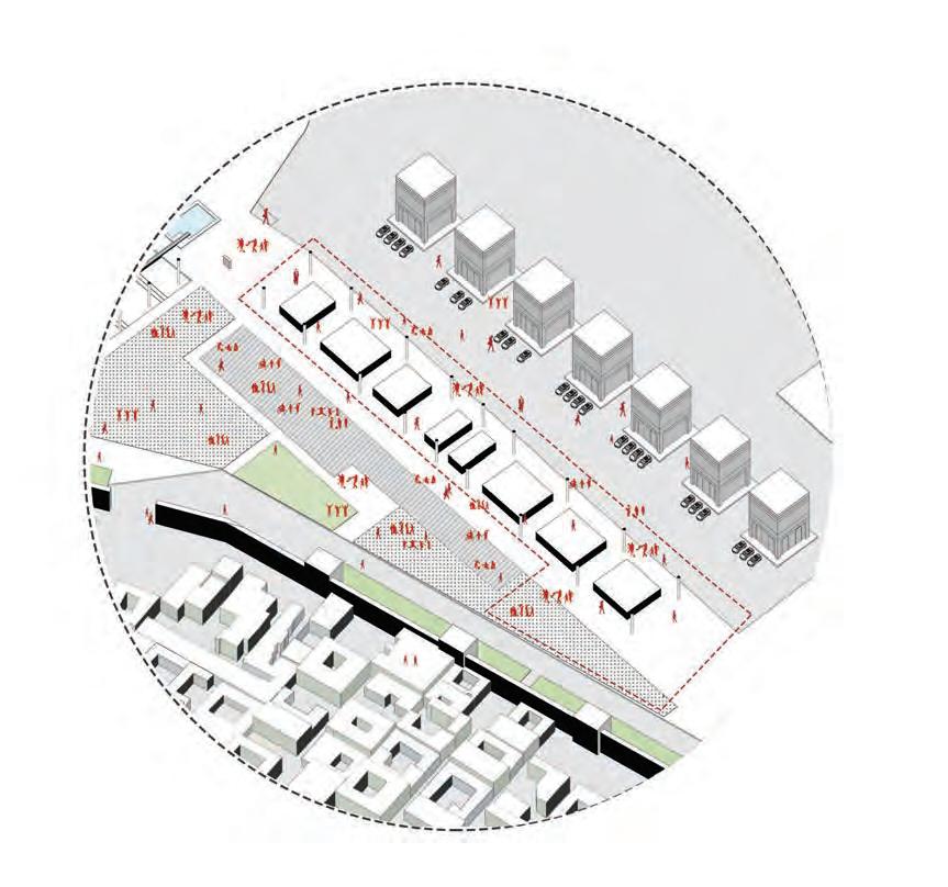 Our urban spatial intervention justifes the notion of hybrid space because of its capability of serving existing multi functional urban spaces in a single container which is architecturally articulated to increase the efciency of the space used, As a general overview the site will witness and address diferent socio economical strata of the user group in one junction of space