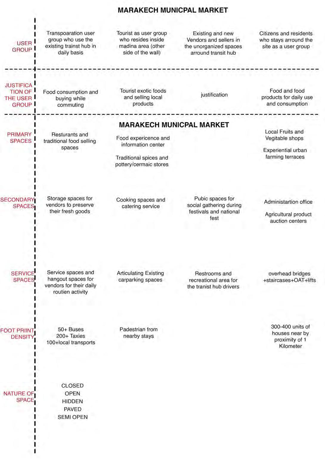 With a rich food culture and a society closely dependent on the act of food processing and food sales, the numerous varieties of food sale in the old Medina area of Marrakech becomes the polycentric model of food urbanism where social interaction, economic interaction and cultural interaction happens at the restaurants, street food stalls, food squares like the Jma el Fna, the fruit juice stalls, fruit, vegetable sellers, souks, marketplaces, spice markets etc. zeroing down to the smallest actors like juice sellers, cigarette sellers and nut - snacks sellers. In order to preserve the rich network of the food sale spaces and shopkeepers, it is imperative to create a hybrid urban space that caters to the diverse layer of food sale spaces as well as ft perfectly to the new modern urbanisation models of Marrakech.