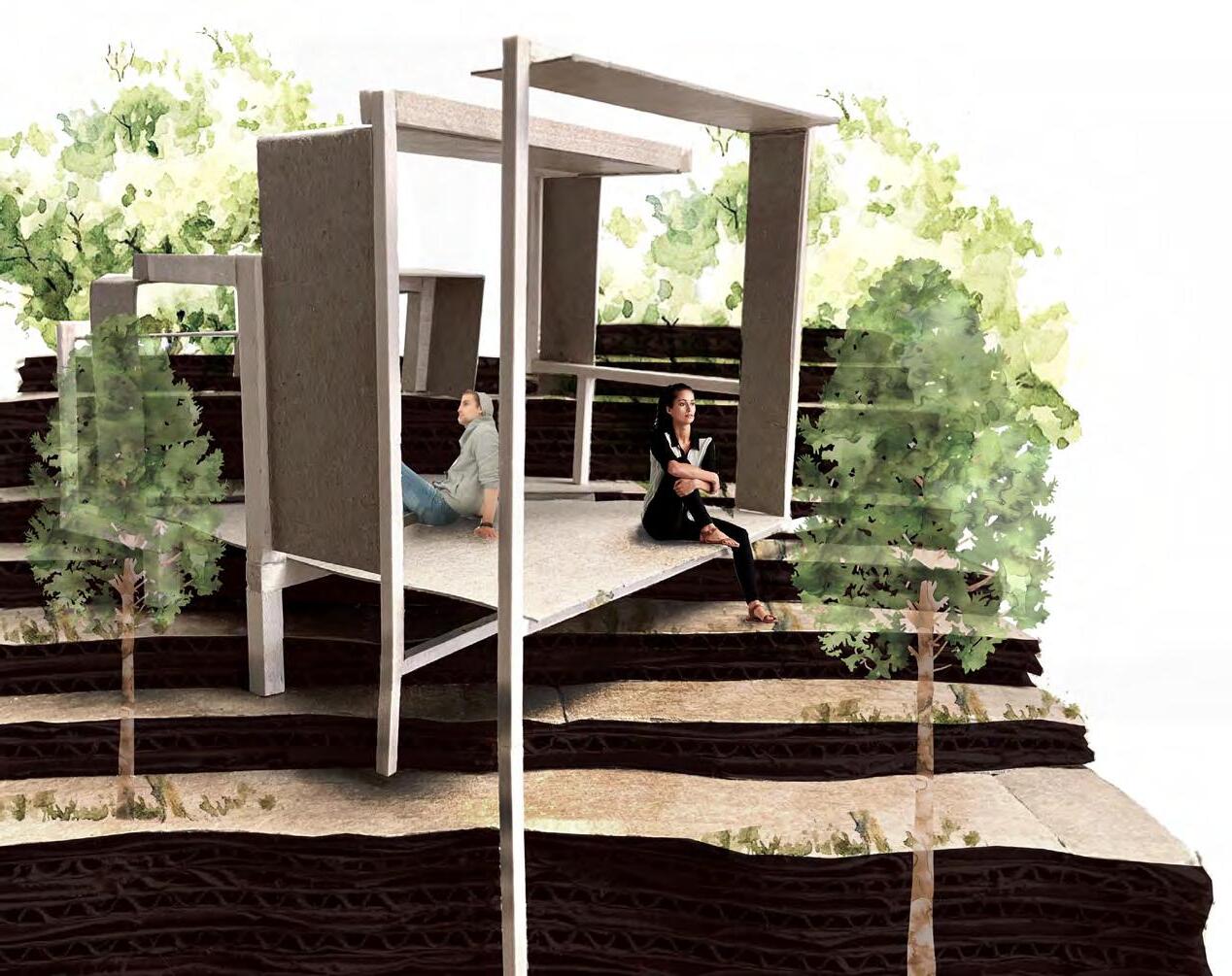 in the case of this meditative space, the overlook transgresses past itself, growing, folding, and being reworked. however, the act of transgressing represents more than just the overlook’s lines and planes. the road to justice is an ongoing battle of transgression, breaking through the boundaries of prejudice and inequality.