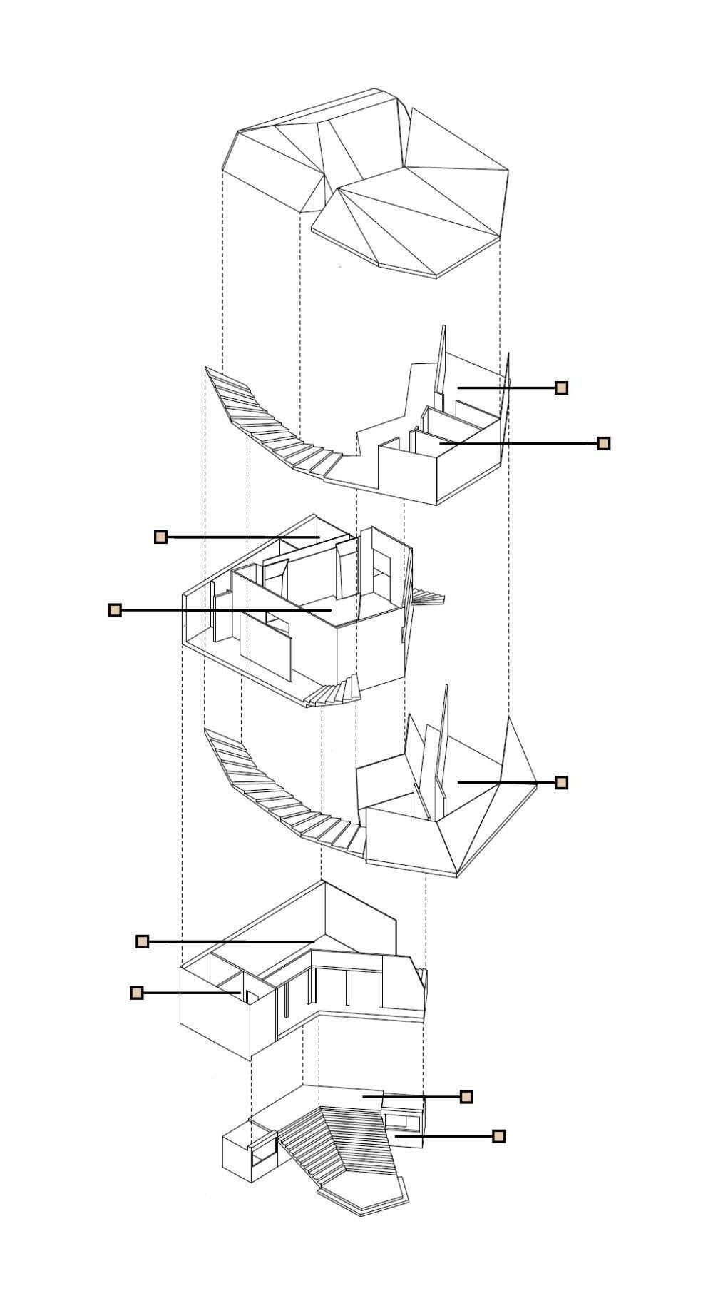 based off of the blues scale, blu house fluctuates in height to mimic the progression of notes. it is modeled in the shape of a loose knot, suggesting a looping melody that weaves and builds off of itself- growing and ebbing to the sound of the music.