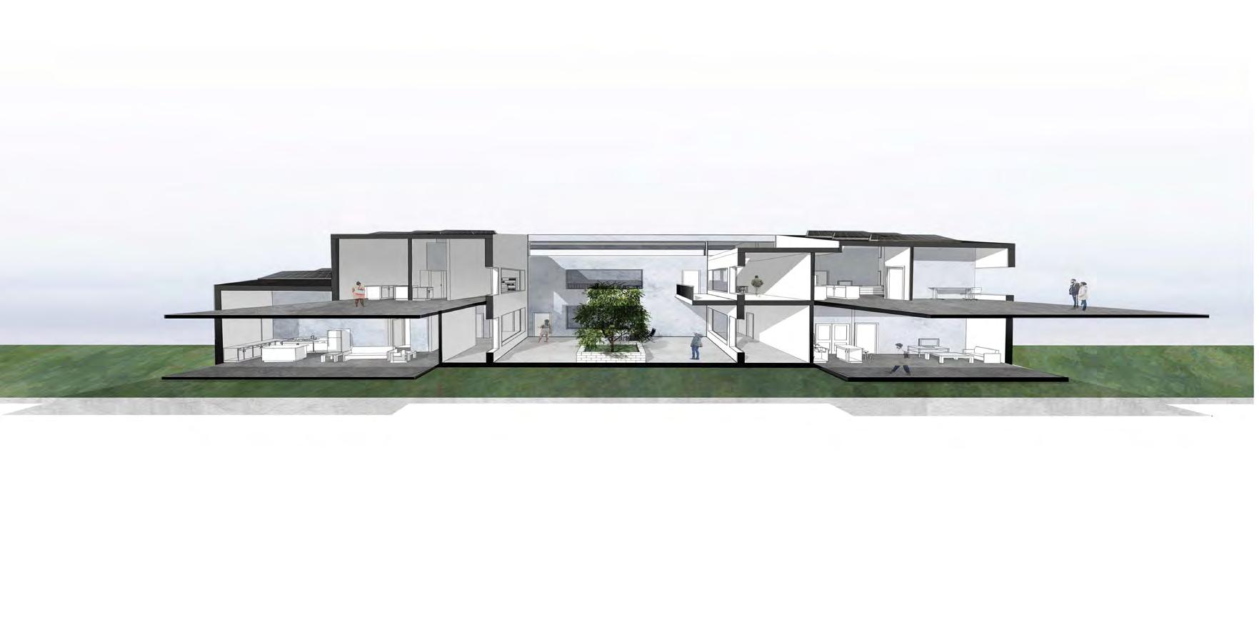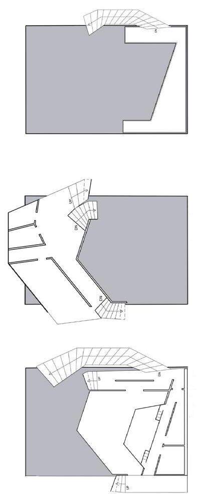 the main program of the building, the theatre, is encased by the surrounding floors. the split level floor plan is repeated and mirrored, uniting and balancing the building.