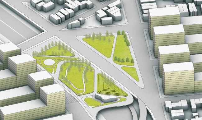 flexible open space for big events flexible open space for big events seating area dedicated bike lane continues pathwalk corridor toward the cemetary station big plaza mix-use station buiding briding park over the highway corridor +green area corridor+entrance Outdoor seating area stairs+seating area