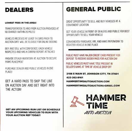 ARE YOU LOOKING TO SELL YOUR VEHICLE? LOOK NO FURTHER! We are now accepting vehicles to our auto auction from the public, it costs NOTHING to run the vehicle through our auction, you will only pay a fee if your vehicle is sold! Come by and see us or message us on Facebook for more information! Here is what you will need: 1: Clean title to vehicle in your name 2: Set a reserve price on your vehicle (what does it take to sell it) 3: Form of ID That’s it! Bring your vehicles by and we will get them checked in for the upcoming sales! Buyer/Seller Fees: $1-$5000 = $100 $5,001-$10,000 = $175 $10,001-$20,000 = $200 $20,001 or more = $225 NO SALE = NO CHARGE 2106 E Main St. Johnson City TN • 423.262.8161 facebook.com/HammerTimeAutoAuction DEALER AUCTION: DECEMBER 16TH AT 11:00 AM PUBLIC AUCTION: FRIDAYS STARTING DECEMBER 16TH AT 6:00 PM theloafer.net | December 13, 2022 5