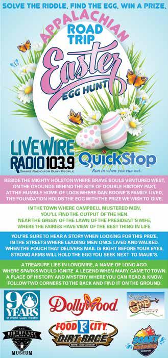 03 Northeast State Theatre Stages Eurydice April 20-23 04 Spotlight 05 Dancing on FIddle Traditions 06 Renowned Illustrator Paints Mural at ETSU 07 Tri-Cities Nightlife 08 Puzzle Page 09 Pets of the Week 10 Making the Most of Opportunities in Public Art 11 Things To Do 12 Tri-Cities Faces and Places 14 Visit Johnson City to Host Disc Golf After Hours 14 Biker Events 18 Tusculum Hosting Reading by DIstinguished Poet and Essayist 20 Spring Train Excursion Through Smokey Mountains 22 WQUT Concert Schedule 15 Beanz Biker Corner Backyard Terrors 17 Social Sentiments: Reframe Your Posts 19 Tea Time with Appalachian Barbie: Trends to End in 2023 21 Pop Life: True Spirit 23 Batteries Not Included: The Easter that Almost Wazn't LBD FAMILY MEDIA