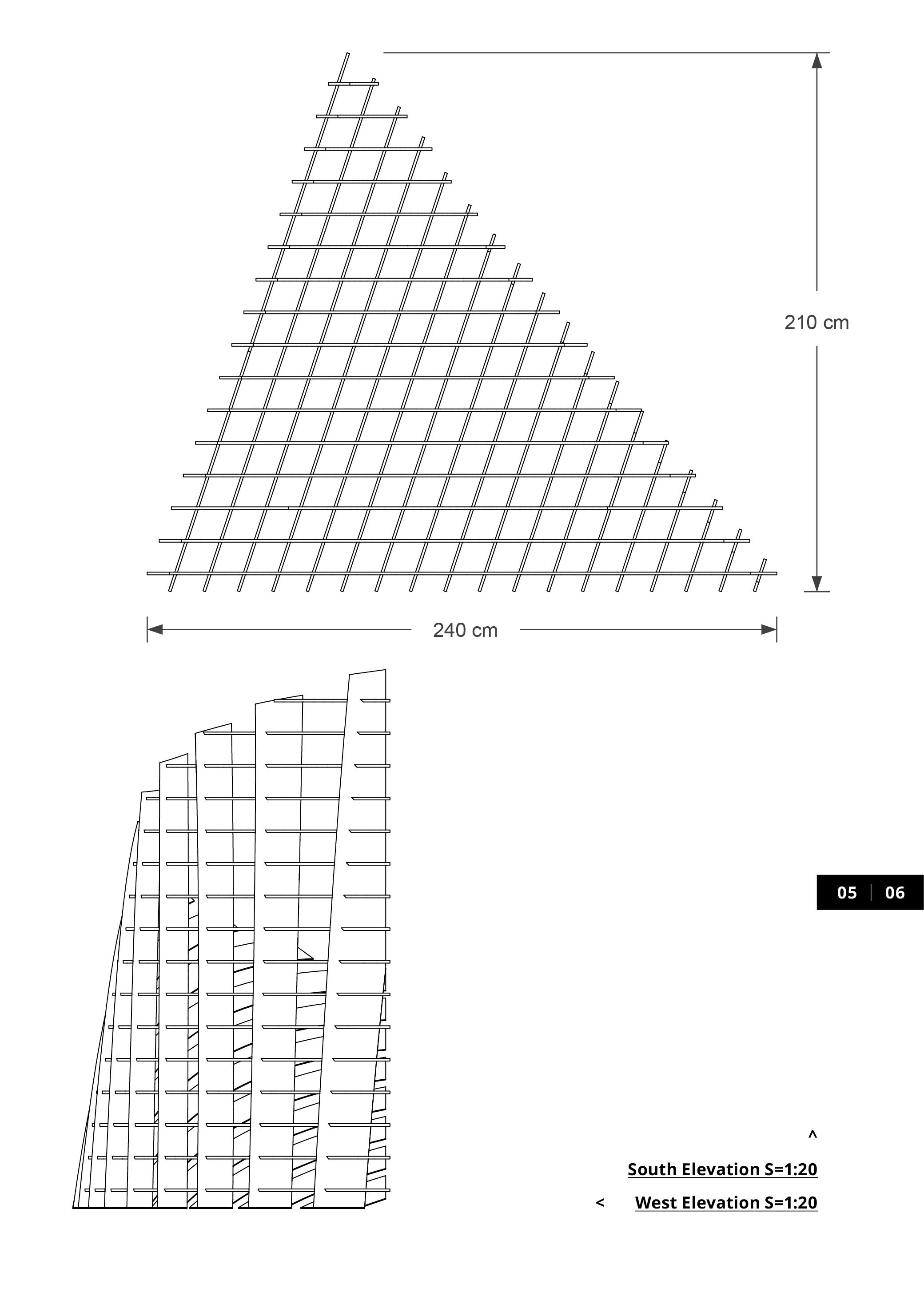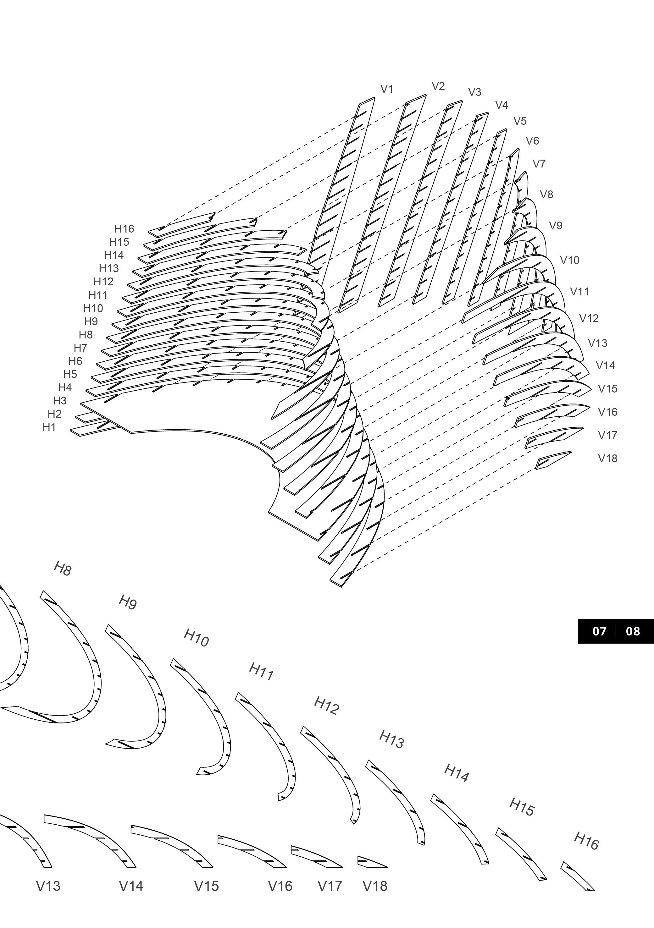 By using equidistant segmentation, the design layers the nodes of the bamboo shoot as it grows, allowing for a transformation in its structural texture.
