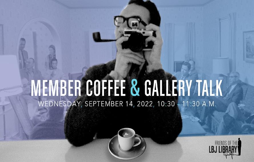 September 14, 10:30 a.m.: Member Coffee and Gallery Talk Members are invited to join us for a gallery talk and refreshments on September 14 at 10:30 a.m. Skip Okamoto, son of President Johnson’s White House photog rapher, Yoichi Okamoto, will speak to members about his father’s legacy. Members will have an opportunity to tour the exhibition Yoichi Okamoto.