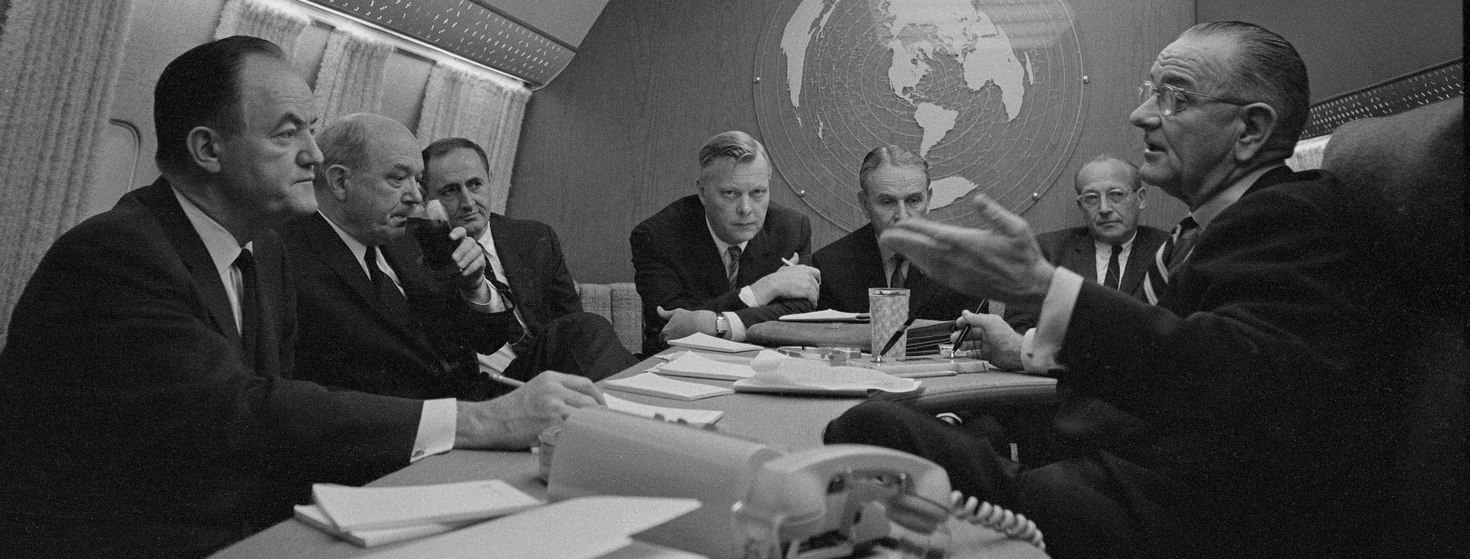 *Denotes ex-officio member President Lyndon B. Johnson meets with advisors, including Vice President Hubert Humphrey, Sec. Dean Rusk, Sec. John Gardner, and Walt Rostow aboard Air Force One, 02/08/1966, Yoichi Okamoto