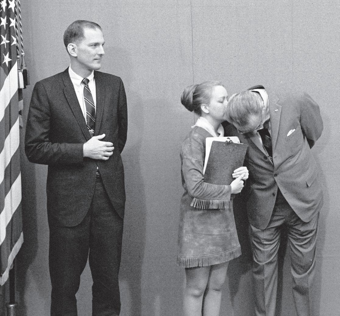 ON THE COVER: LBJ is seated in front of small desk behind large one. He is writing on paper as Kearns leans over, smiling, watching. Jones is standing in background, smiling, looking on. 5/15/1968 (Photo by Yoichi Okamoto)