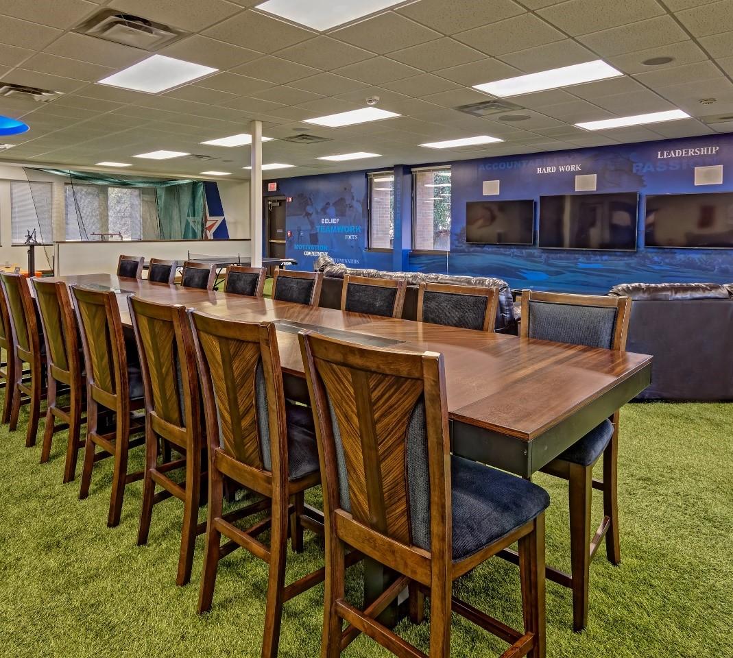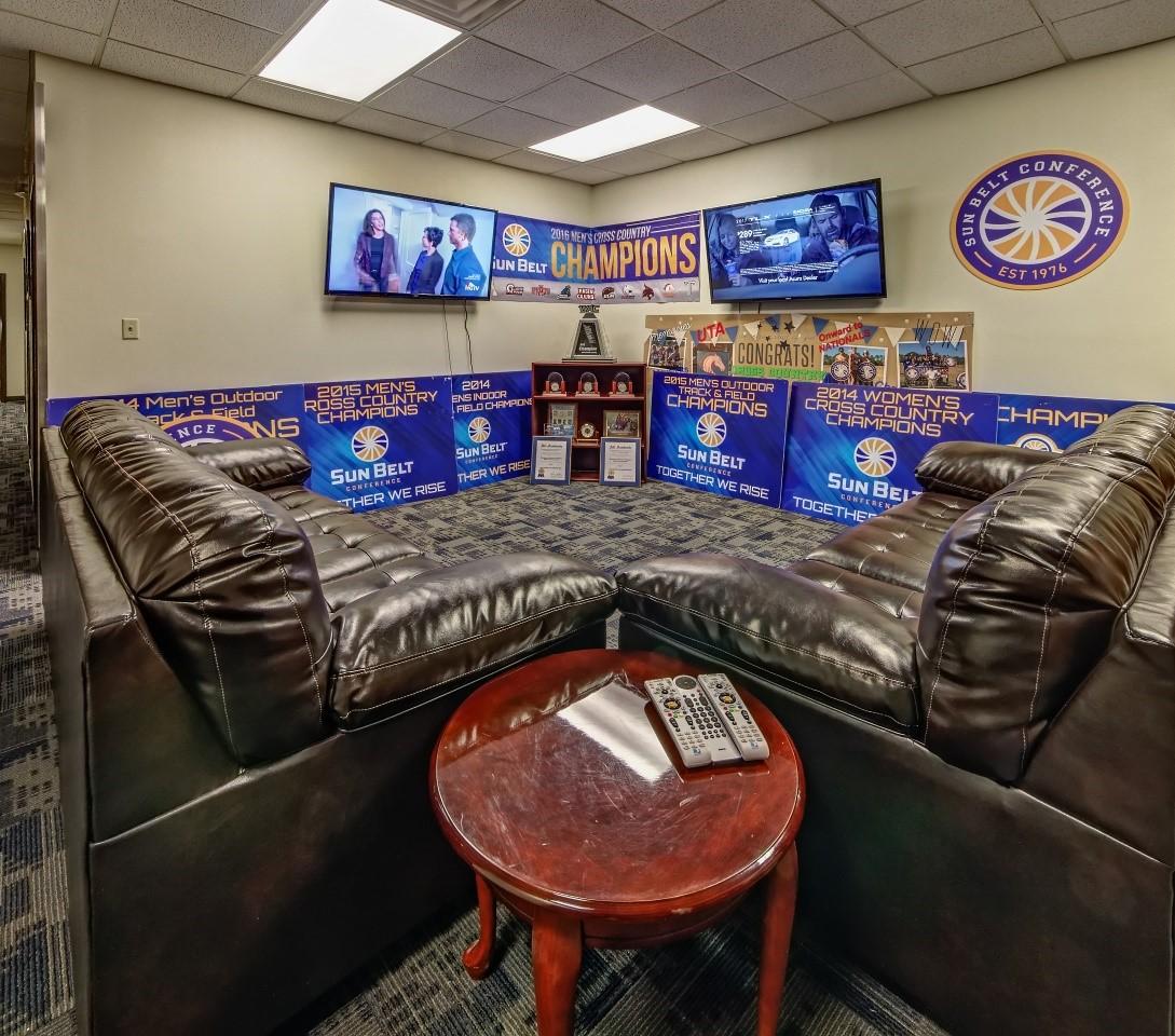 The University recognized a need to create a golf team club house and training facility. The newly renovated Gilstrap Athletic Complex features three coaches offices that are strategically adjacent to the teams meeting space. The clubhouse also features a large indoor putting green and a state of the art Virtual Golf Swing analyzer to improve players competitive abilities. This space also includes a TV and gaming lounge, and an Academic Advisor suite with a group study are for the team members. Finally, the Clubhouse is branded with a promenade “Maverick” LED backed logo in the celling.