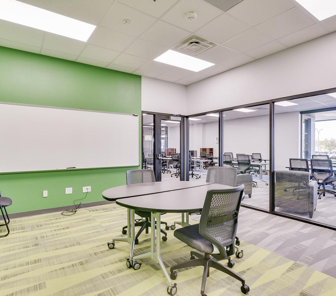 ACCHS is closely partnered with Tarrant County College’s Southeast Campus, and has been given an entirely new look both inside and out to fit a more college-like feel. The 35,000 SF building received major infrastructural improvements including the full replacement of the roof, HVAC system, sprinkler system, commercial kitchen, student toilets, along with upgrades to the data, security and electrical systems. The existing room layout of the campus was reconfigured to include science labs, a kinesiology room, computer labs, large convertible meeting rooms that can be partitioned into smaller classrooms, a digital media center with break out meeting rooms, and a large dining room that can serve as an afterhours meeting space.