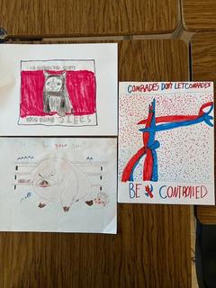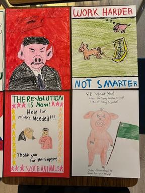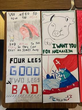The 8th grade English I class is studying the novel, Animal Farm. Most recently, students read chapter 3 and explored the purpose of propaganda in the text Students spent time analyzing Squealer's speech, examining WWI war posters, and crafting their own original versions of propaganda Students used various persuasive techniques to push their message from the novel. We have also spent time familiarizing ourselves with the Russian Revolution and how the novel is an allegory to this important historical time period