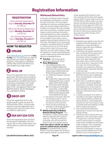 Fill out the registration form in the program guide. Payments may be made by check or credit card. Checks should be made payable to Lake Bluff Park District. If paying by credit/debit card include the complete card number, expiration date, CVV#, and signature. Mail to: Lake Bluff Park District, 355 W. Washington Ave., Lake Bluff, IL 60044.