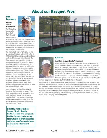 Rich Rosenberg co-runs the Lake Bluff Park District platform tennis program for the men, women, and juniors along with paddle professional Kari Falls. Prior to that, Rich competed regularly in both the national ranked platform tennis association sanctioned tournament and the Charities tournament.