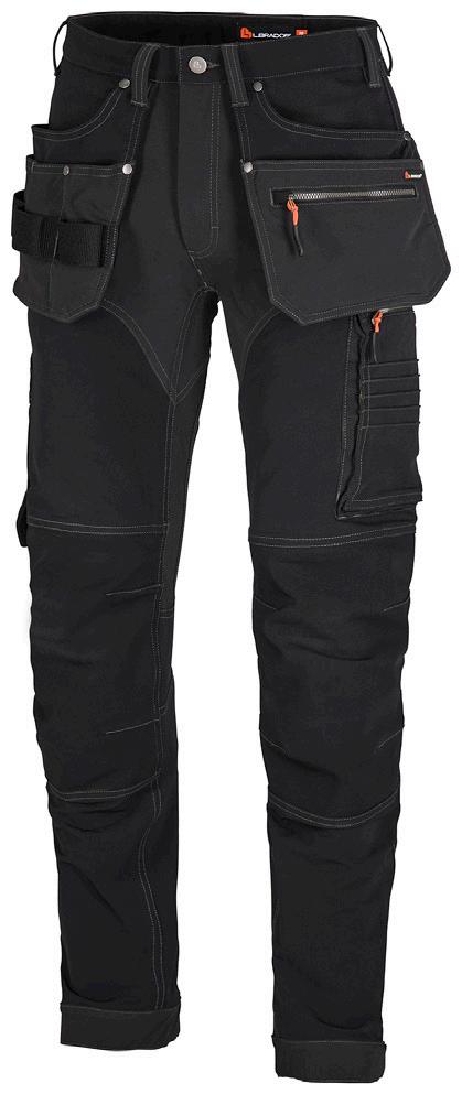 Deux poches avant. Poches arrière passepoilées. Poche genouillère. Poche de jambe droite avec simple poche mètre et poches supplémentaires. Poche de jambe gauche avec fermeture éclair et poche pour téléphone portable. Passant extra-large à l’arrière.