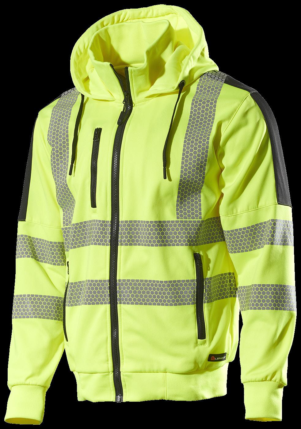 Eine Brusttasche und Seitentaschen mit eingelassenem schwarzen Reflektor. Reflektierende Einsätze an Schultern und Saum für erhöhte Sichtbarkeit. Zwei Seitentaschen und Ausweiskartenhalter. Eine Innentasche mit Reißverschluss.