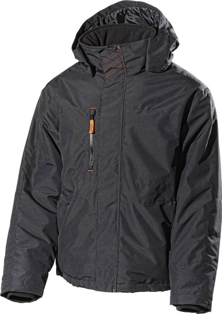 Täyspitkä vetoketju ja oranssit kontrastiväriset yksityiskohdat.