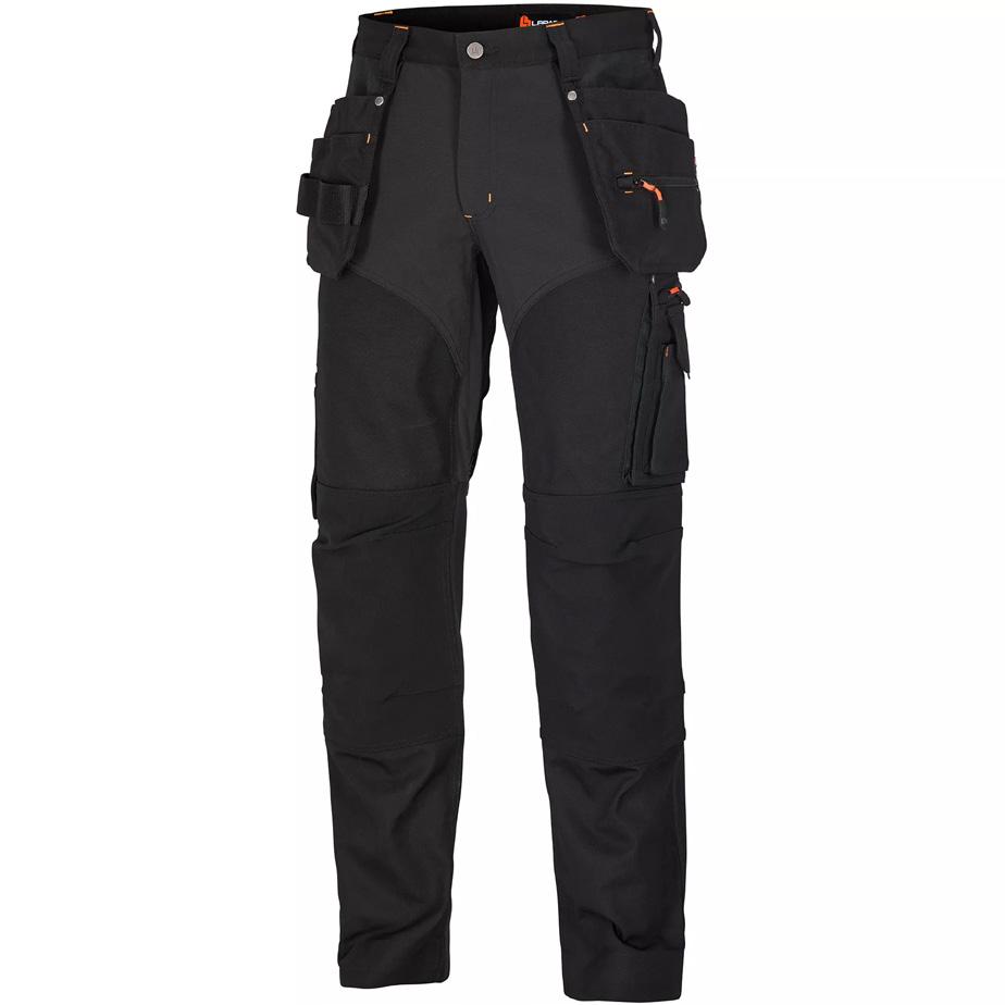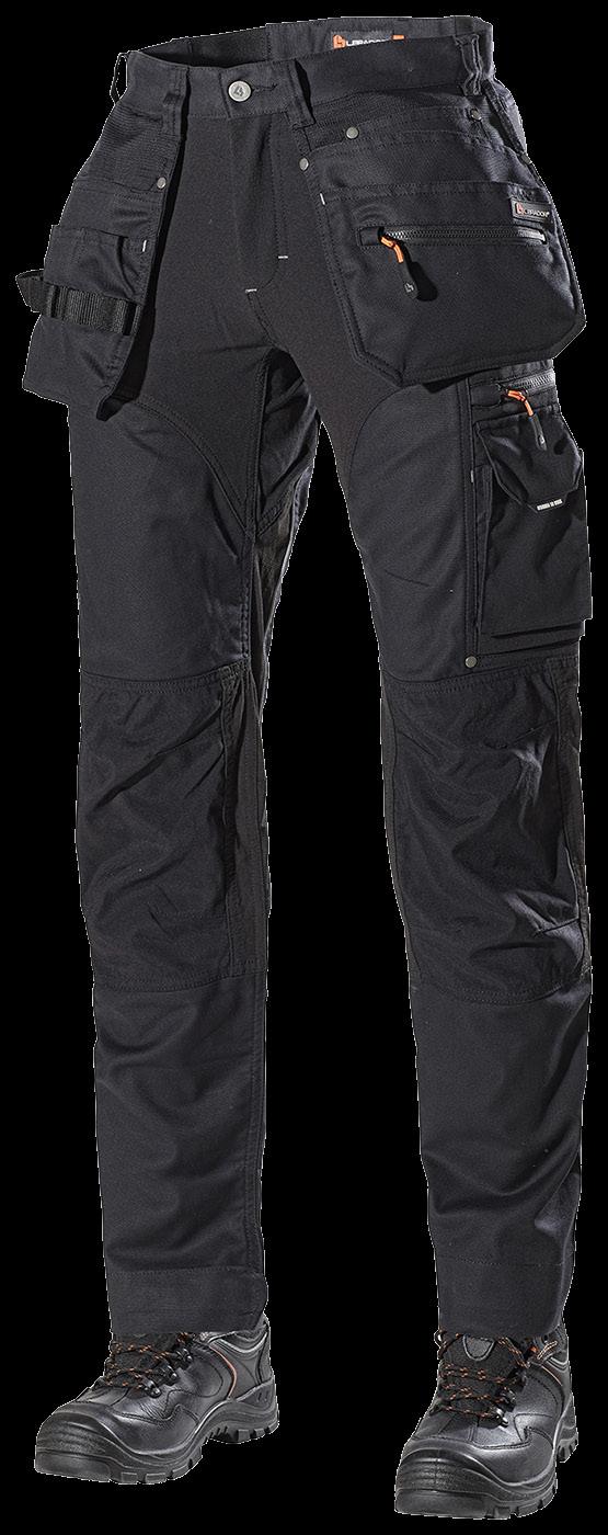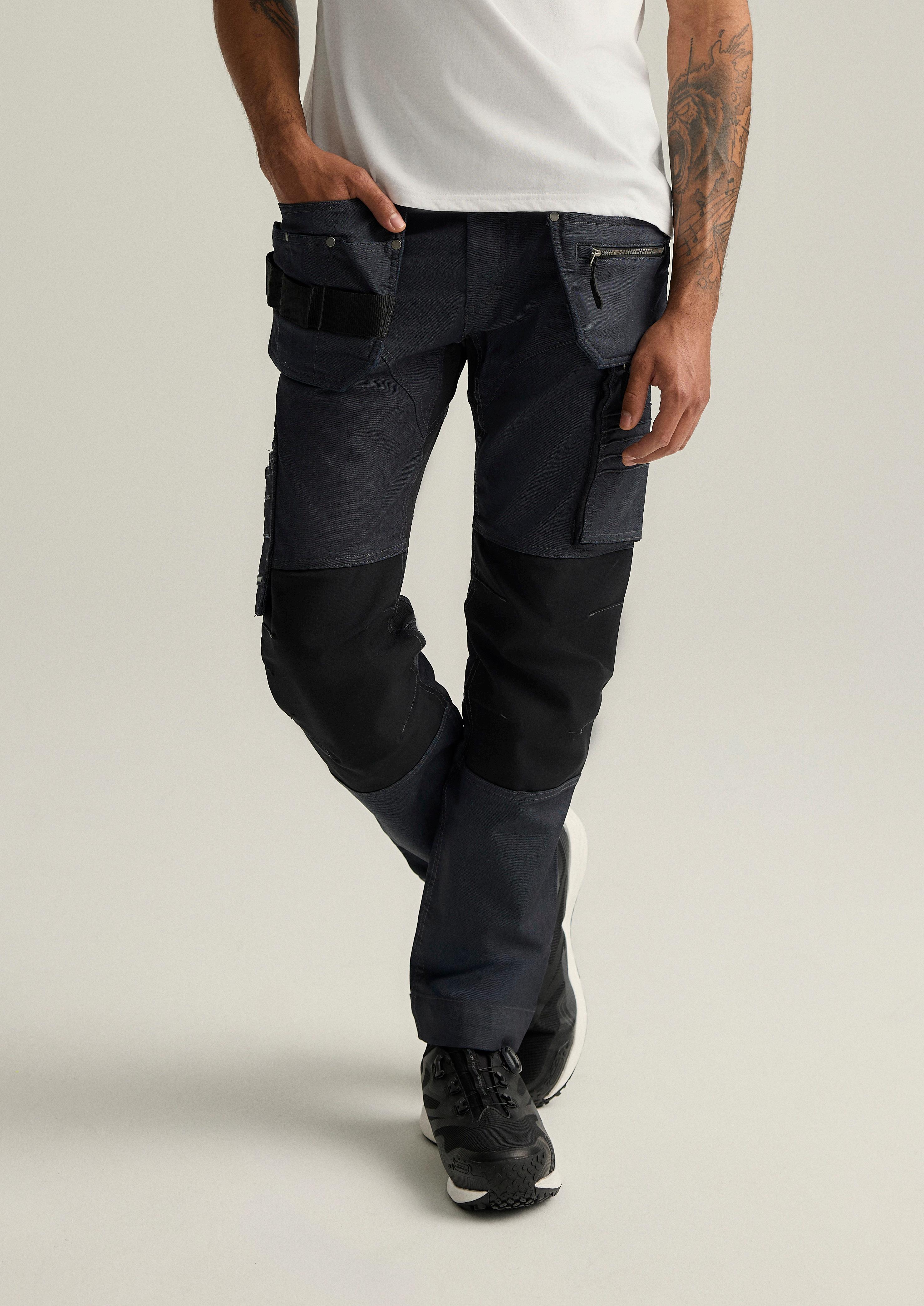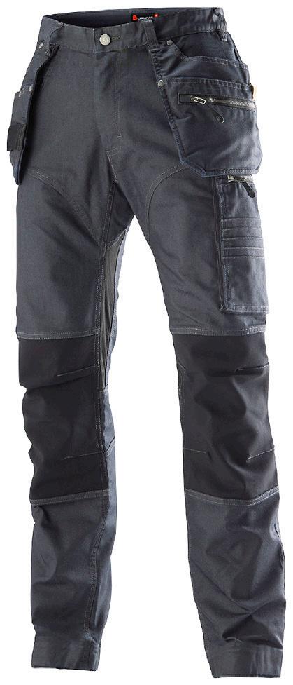 ZAKKEN EN HOUDERS Twee voorzakken. Ingezette achterzakken met paspel. Kniebeschermzak. Rechterbeenzak met eenvoudige duimstokzak en extra vakken. Linkerbeenzak met rits en telefoonzak. Extra brede lus aan de achterkant.