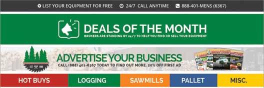 The Tree that Started it All! Since 1986, Lumbermens has published a monthly circular reaching pallet industrial worldwide. ADVERTISING SALES Morris Woods (888) 401-6367 ext. 704 morris@lumbermens.co MARKETING DIRECTOR John Williams (888) 401-6367 ext. 701 (888) 401-6367 ext. 702 sam@lumbermens.co Austin Woods (888) 401-6367 ext. 703 austin@lumbermens.co MAILING ADDRESS P.O. Box 1916 Columbia, TN 38402-1916 Send address changes to: Lumberman's Exchange P.O. Box 1916 Columbia, TN 38402 The Lumberman's Exchange is published monthly by Woods Publishing, P.O. Box 1916, Columbia, TN 38402. All rights reserved. submissions discretion be and been content submitted and writers, the Lumberman's Exchange, its principles and associates, are not held liable for errors or omissions. Reproduction, in whole or part, is prohibited without written consent. ©2017 Woods Publishing ** CALENDAR** MID-ATLANTIC LOGGING & BIOMASS EXPO STATE YS Fri, 18 August Boonville, www.starwebhostin net/woodsmen/ SOUTHWEST EXPO Fri, 25 August - Sat, 26 August Hot Springs, Arkansas www.arkloggers.com 72ND ANNUAL GREAT LAKES LOGGING & HEAVY EQUIPMENT EXPO Thurs, 7 Sept - Sat, 9 Sept Esca MID-ATLANTIC IOMASS Fri, 1 Selm www.midatlantic-logging-biomassexpo.com/ KENTUCKY WOOD EXPO Fri, 15 Sept - Sat, 16 Sept Lexington, Kentucky http://www.kfia.org/ KentuckyWoodExpo.aspx THE Fri, ww ** INFO LINK** B & B Mfg 18 M&F Gauge 28 B. 16 Meadows ................ 33 Baker 7 Menominee ..................... 29 Bell's 27 Metal 30 Brute 31 Midwest .............. 26 Buck Equipment (AIM) 36 Morbark 9 Corley Mfg .............................. 32 Multitek ................................... 12 CRD Metalworks 25 Piper's Saw Shop 13 CW Mill-ArmorHog .............. 17 Rotochopper............................ 40 CW Mill-Hogzilla 15 Row Electric 20 Dyna Products ........................ 35 Sawmill Exchange 11 Empire 8 Select 19 Great 34 Smith 4 Hahn 3 The 39 Hurst Boiler 14 Thomas Industrial Controls..... 10 Iron Bull ................................... 21 Union Grove Saw & Knife 2, 37 Kilgore Saw 22 Uni versal Refiner 23 Lignomat ................................. 24 WoodMizer ................................ l - USED FORESTRY EQUIPMENT FOR SALE l§ SELL YOUR EQUIPMENT TODAY 0 24/7 SUPPORT FOR CLASSIFIEDS Call 888.401.MENS prices, and of all equipment at www.LumberMB\ISmagazine.com & HEADSAWS Danckaert Band Resaw Roughly 10 hours on this machine since it has been rebuilt, it has a 24foot in feed deck 20 foot out feed deck with 44 inch wheels, and all the bells and whistles, its a production conveyers airbags, Mcdonough pressure guides. To p Casting wheel is supported on both sides. This is an extremely accurate machine in ve1y good condition, Cuts 130 feet a minute also has CLT presses. Item ID 13876. Austin x703 S & W 125 Band Mill with hours computer Set 22ft. track 13434. Sam x702 CARRIAGES & DRIVES 2010 Cardinal HD Carriage Carriages (Sawmill) Cardinal Carriage line it includes carriage with onboard log turners, carriage drive, carriage, sawyers controls, cabinet drives for carriage knees, husk including 48" bottom 36" top saw STACKING RAC www.BakerProducts.net 800.S48.6914 I S73.663.7711 L! (888) 401-MENS TO VIEW DESCRIPTION, PRICING AND LOCATION - VISIT WWW.LUMBERMENSCO.COM LOGGING John Deere 748G3 Item ID: 99967 Contact: AUSTIN Email: Austin@lumbermensco.com Phone: 888-401-6367 EXT 703 (C) 931-797-8029 John Deere 848H Item ID: 99963 Contact: AUSTIN Email: Austin@lumbermensco.com Phone: 888-401-6367 EXT 703 (C) 931-797-8029 Tigercat 610E Item ID: 99935 Contact: AUSTIN Email: Austin@lumbermensco.com Phone: 888-401-6367 EXT 703 (C) 931-797-8029 John Deere 748H Item ID: 99920 Contact: AUSTIN Email: Austin@lumbermensco.com Phone: 888-401-6367 EXT 703 (C) 931-797-8029 Clark 666C Item ID: 99903 Contact: AUSTIN Email: Austin@lumbermensco.com Phone: 888-401-6367 EXT 703 (C) 931-797-8029 CAT 515 Item ID: 99856 Contact: AUSTIN Email: Austin@lumbermensco.com Phone: 888-401-6367 EXT 703 (C) 931-797-8029 2011 CAT 525C Item ID: 99835 Contact: AUSTIN Email: Austin@lumbermensco.com Phone: 888-401-6367 EXT 703 (C) 931-797-8029 11’ John Deere 648H Item ID: 74017 Contact: AUSTIN Email: Austin@lumbermensco.com Phone: 888-401-6367 EXT 703 (C) 931-797-8029 Komatsu 931.1 Item ID: 99949 Contact: AUSTIN Email: Austin@lumbermensco.com Phone: 888-401-6367 EXT 703 (C) 931-797-8029 08’ Timbco 415EX Item ID: 99923 Contact: AUSTIN Email: Austin@lumbermensco.com Phone: 888-401-6367 EXT 703 (C) 931-797-8029 Volvo Delimber Item ID: 99919 Contact: AUSTIN Email: Austin@lumbermensco.com Phone: 888-401-6367 EXT 703 (C) 931-797-8029 Timbco 425 EXL Item ID: 99855 Contact: AUSTIN Email: Austin@lumbermensco.com Phone: 888-401-6367 EXT 703 (C) 931-797-8029 Tigercat 630E Item ID: 84473 Contact: AUSTIN Email: Austin@lumbermensco.com Phone: 888-401-6367 EXT 703 (C) 931-797-8029 2004 Timbco 425EXL Item ID: 100108 Contact: AUSTIN Email: Austin@lumbermensco.com Phone: 888-401-6367 EXT 703 (C) 931-797-8029 08 Rottne H14 Item ID: 100107 Contact: AUSTIN Email: Austin@lumbermensco.com Phone: 888-401-6367 EXT 703 (C) 931-797-8029 Timberjack 240 Item ID: 99828 Contact: AUSTIN Email: Austin@lumbermensco.com Phone: 888-401-6367 EXT 703 (C) 931-797-8029 Timberjack 380A Item ID: 79616 Contact: AUSTIN Email: Austin@lumbermensco.com Phone: 888-401-6367 EXT 703 (C) 931-797-8029 John Deere 648E Item ID: 99894 Contact: AUSTIN Email: Austin@lumbermensco.com Phone: 888-401-6367 EXT 703 (C) 931-797-8029 Timberjack 450C Item ID: 99889 Contact: AUSTIN Email: Austin@lumbermensco.com Phone: 888-401-6367 EXT 703 (C) 931-797-8029 Timberjack 240C Grapple w/Winch Item ID: 99861 Contact: AUSTIN Email: Austin@lumbermensco.com Phone: 888-401-6367 EXT 703 (C) 931-797-8029