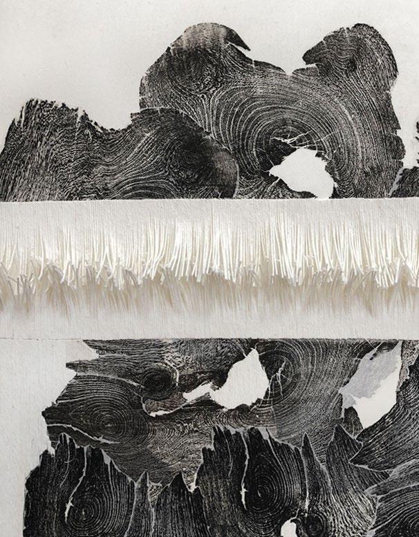 Life continues even where the fire had blazed through not too long ago. You can see new growth, shrubs and wild flowers blooming in stark contrast to charred and blackened mes quite and pine trees. In many cases, the heat of the blaze produced a gallery of grotesque forms: twisted trunks and warped branches and detached outer barks. Charred, naked, hollowed, the trees remain standing, as if they are there to tell us what they witnessed, hang ing onto the memory. I gathered some of the remains, brought them to the studio, and began cleaning off the soot and ashes. To me this act of tending was more like a conversation I had with the trees that may not have survived the fire but still had a story to tell. As I cleaned and added handcoiled paper, I felt connected to the beauty, horror, and resilience of nature. The afteref fects of wildfires are rarely part of their story, which ordinarily focuses on the spectacular blazes that ravage large tracks of parched wilderness. Windblown flames, record heat, Hotshot crews—these are the storylines. What is there to say about burn scars themselves? Whether forests will be resilient to things like wildfires and climate change is a huge ques tion. A lot depends on the recovery time of areas damaged by severe burns, which can be long. A piece of forest with moderate harm might show robust signs of recovery a decade from now. A really bad burn area might not re cover for 100 years. As I conceive it here, the process of healing begins now with a conver sation with the remains of fire.
