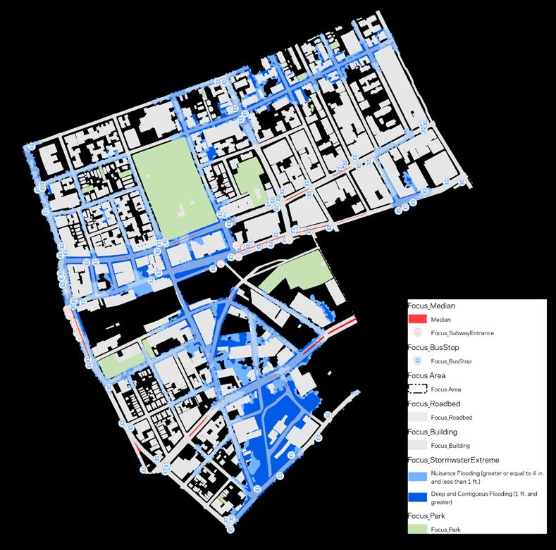 The introduction of bioswales in these medians presents an opportunity to mitigate the effects of inland stormwater flooding, particularly on major roads with high traffic volumes where medians are more common. This strategy is especially relevant in areas with wide roads near industrial and commercial zones. The implementation of bioswales in the heart of downtown Jamaica is anticipated to significantly alleviate flooding issues, contributing to the environmental and infrastructural resilience of the area.