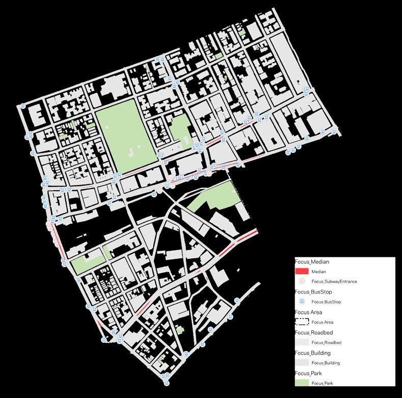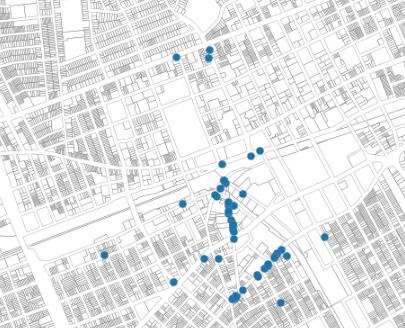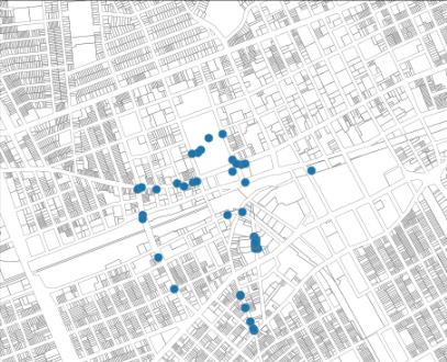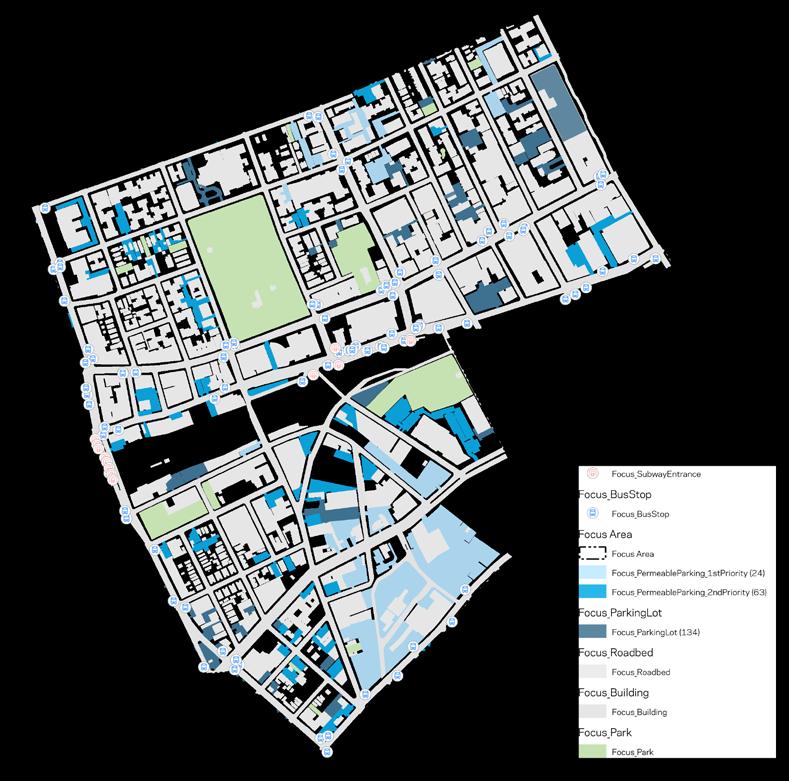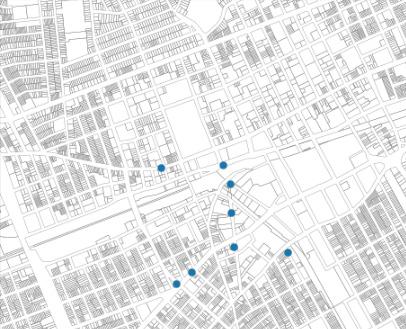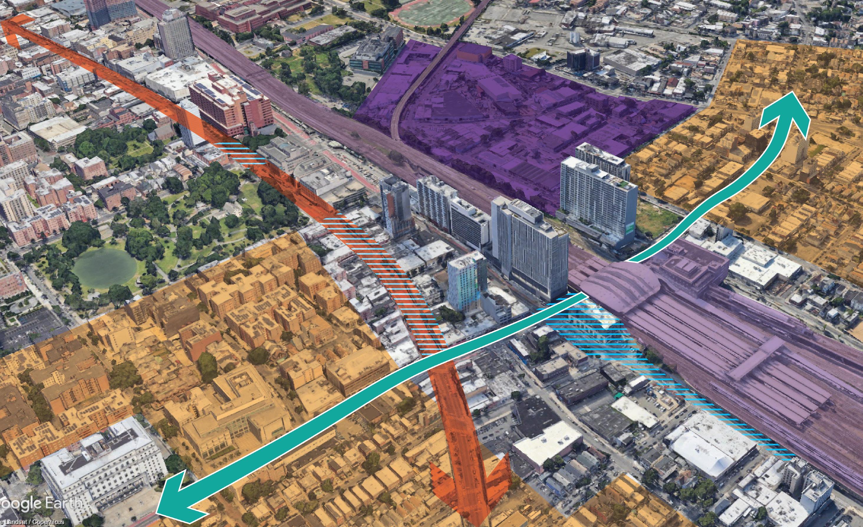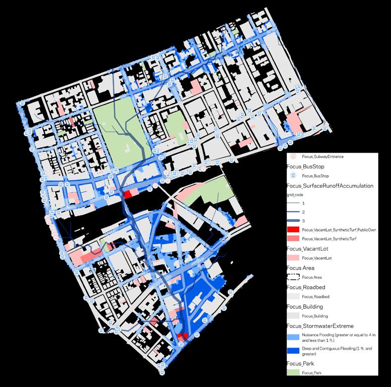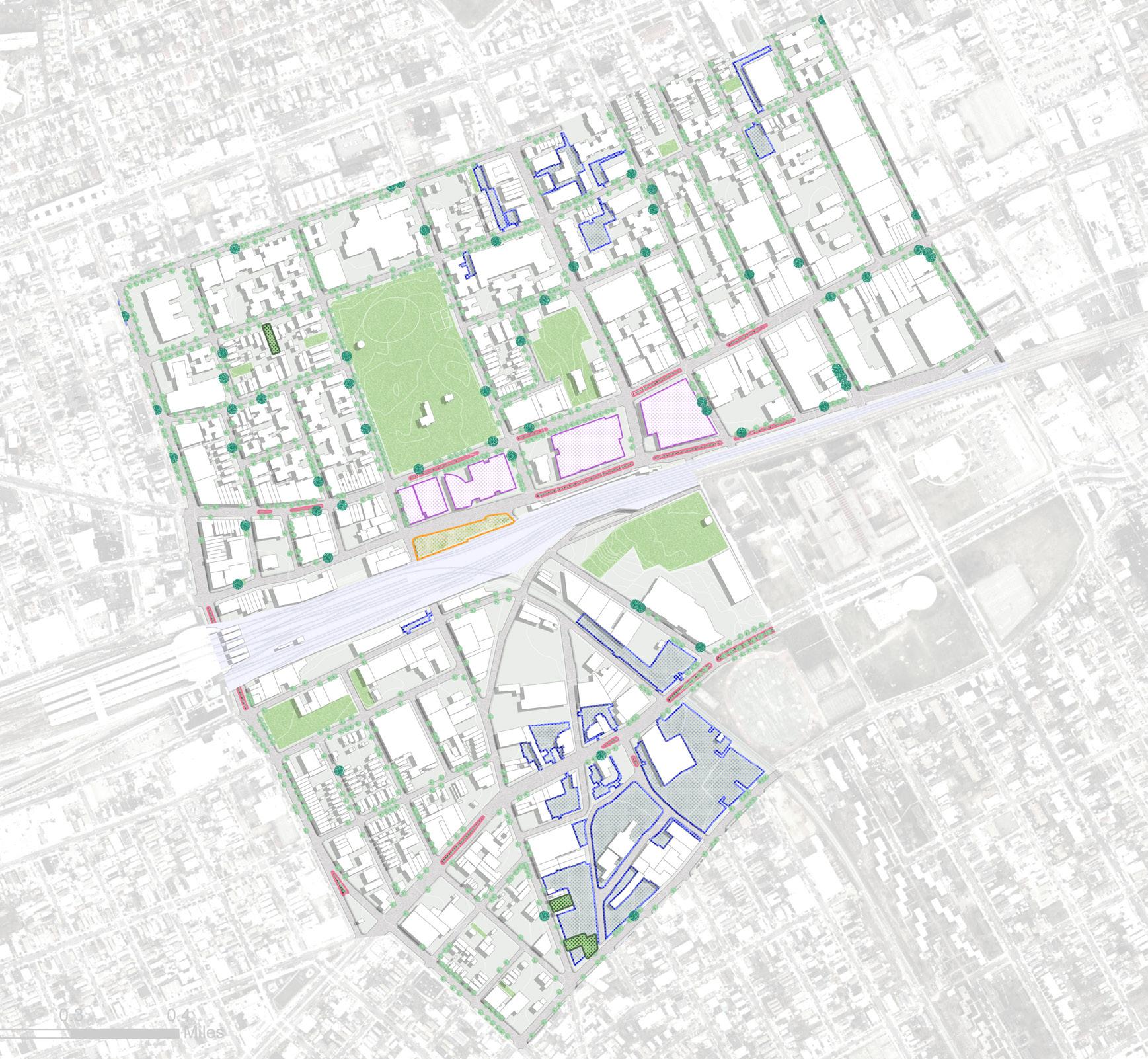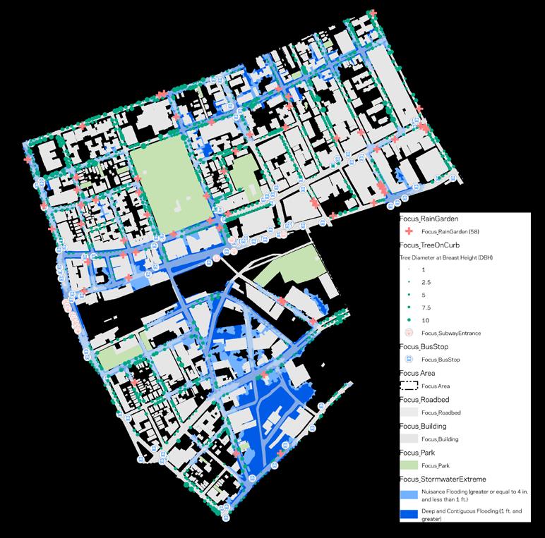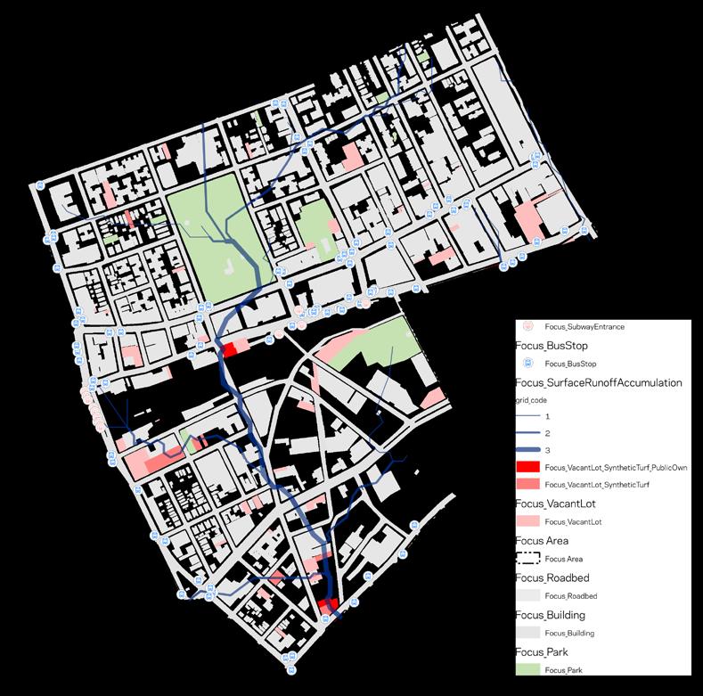adjacent to railroad, industrial blocks limit direct accss to residential areas, rising safety issues in their surrounding conditions Enables the district to serve as transit hub, but its surrounding retaining walls limits pedestrian access to travel within the district Constant stormwater flooding issues along with absensce of green infrastructures and permeable pavements in the area In response to disconnected accessibility within the neighborhood, potential site for adaptation of green infrastructures along with streetscape interventions