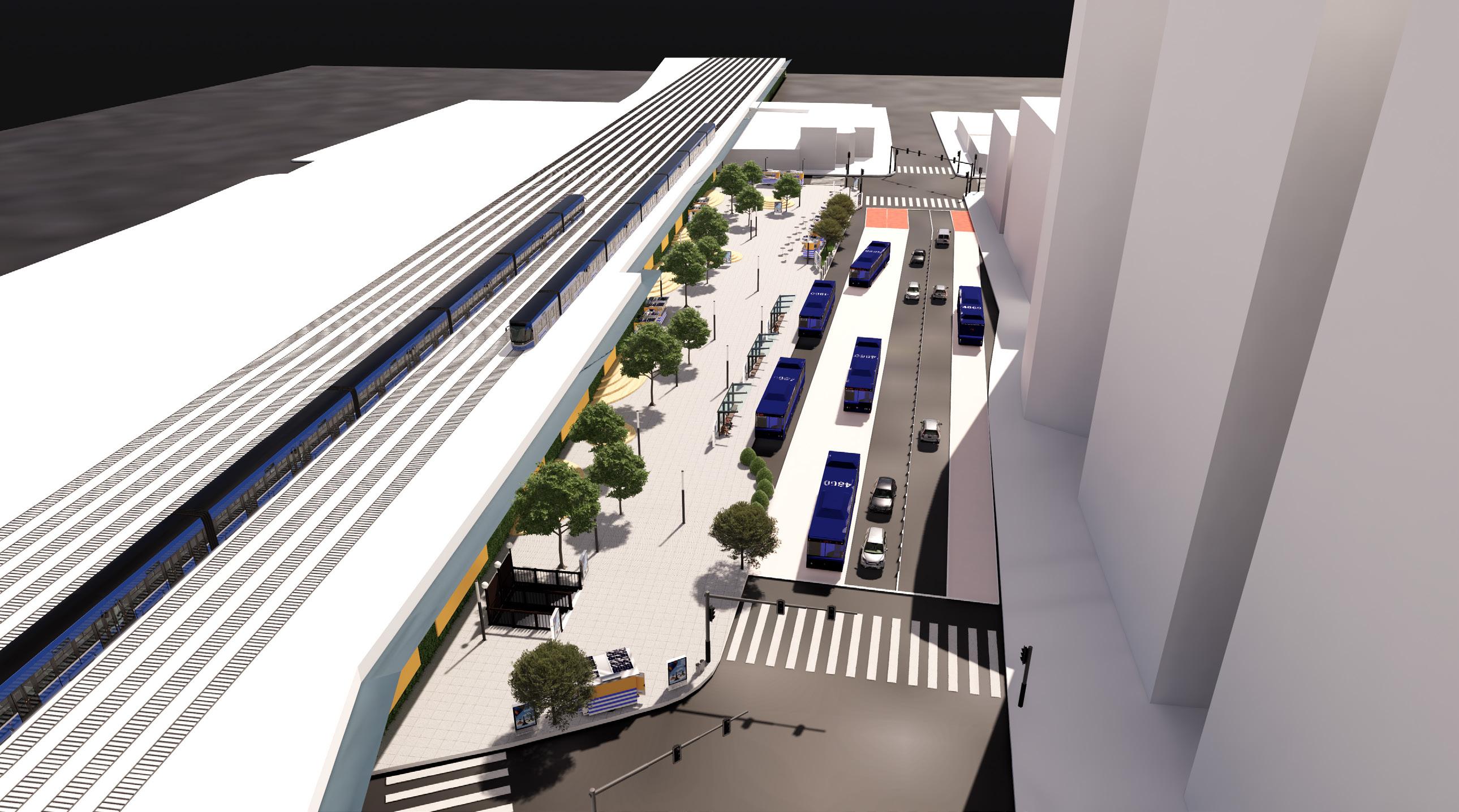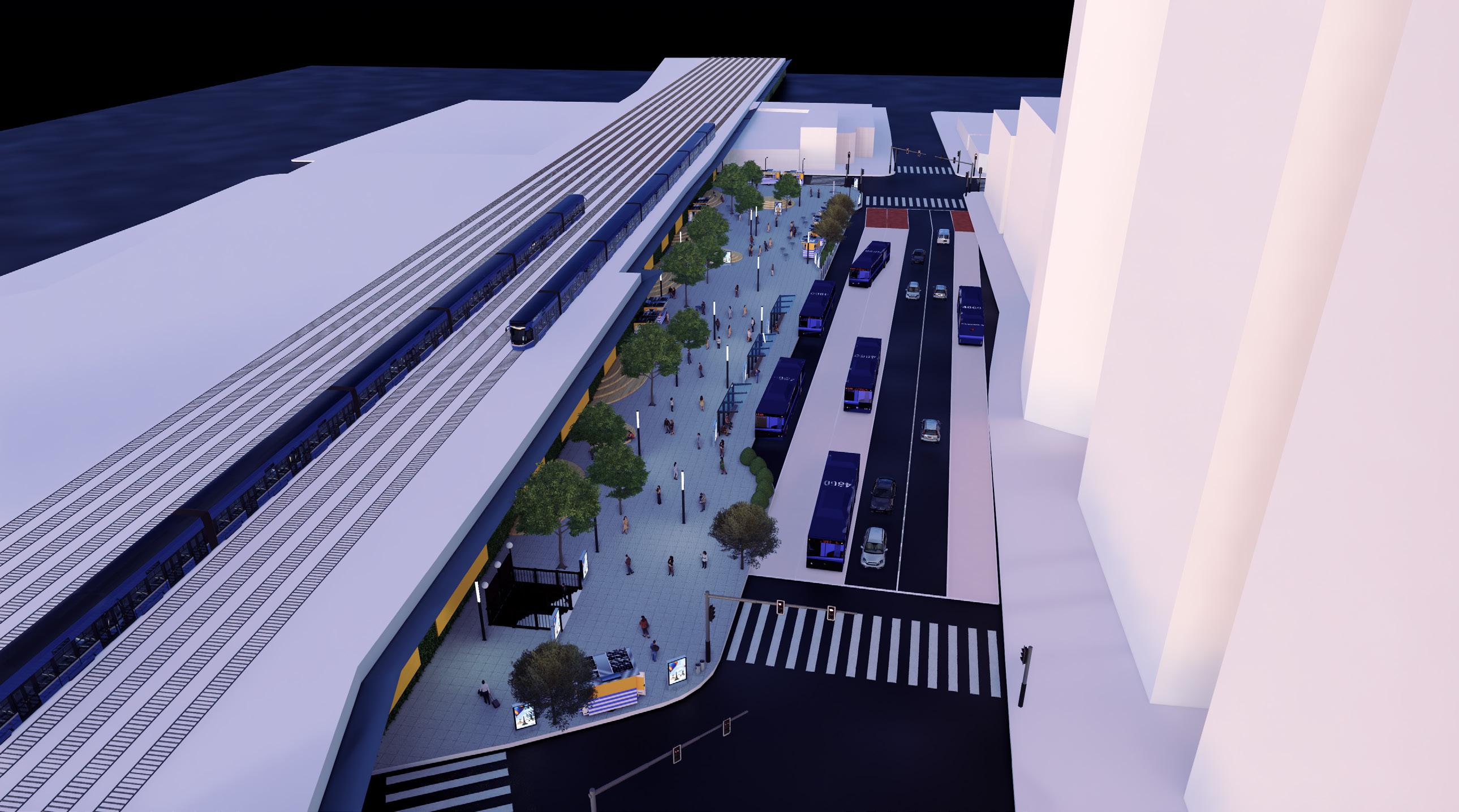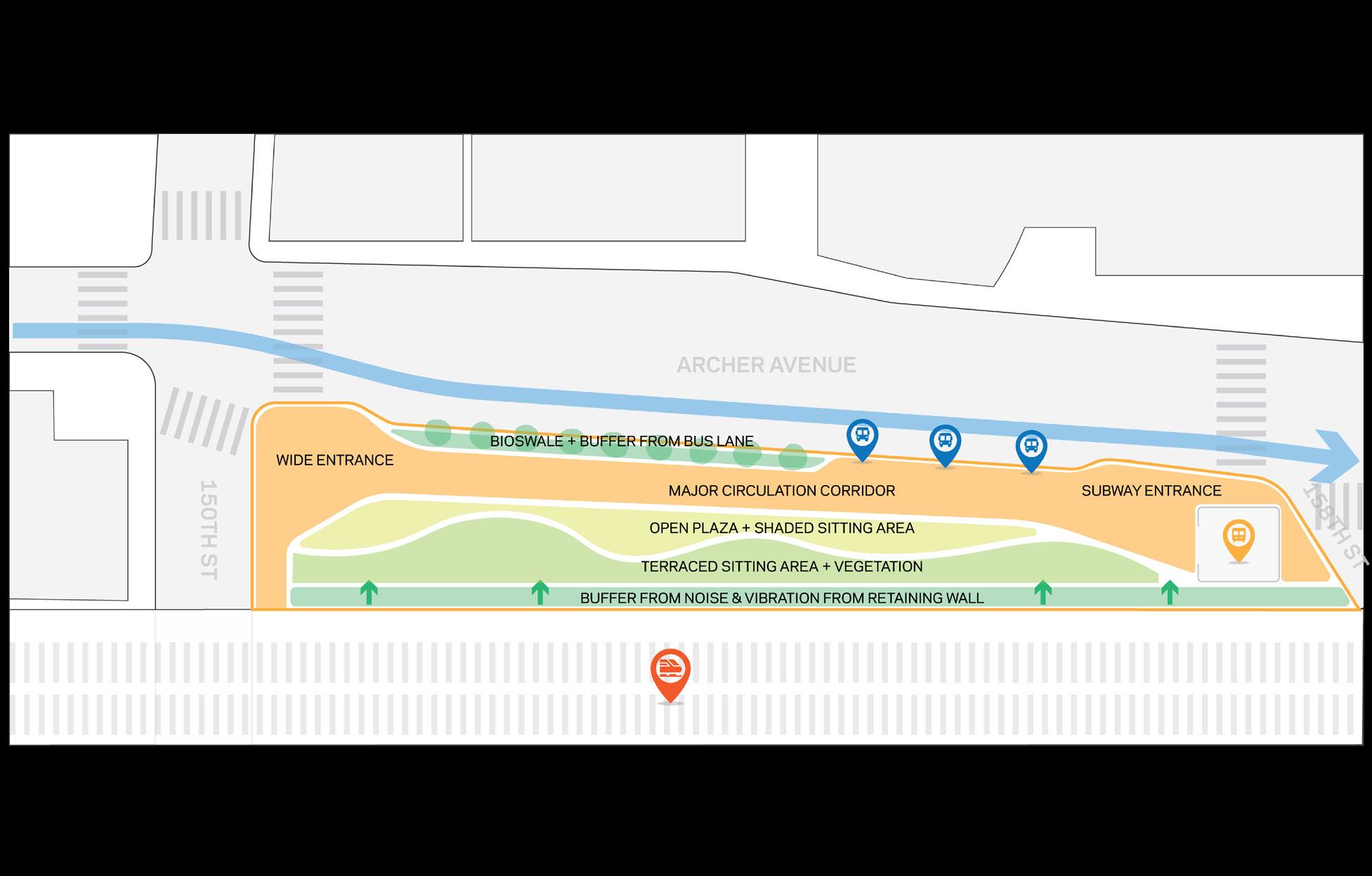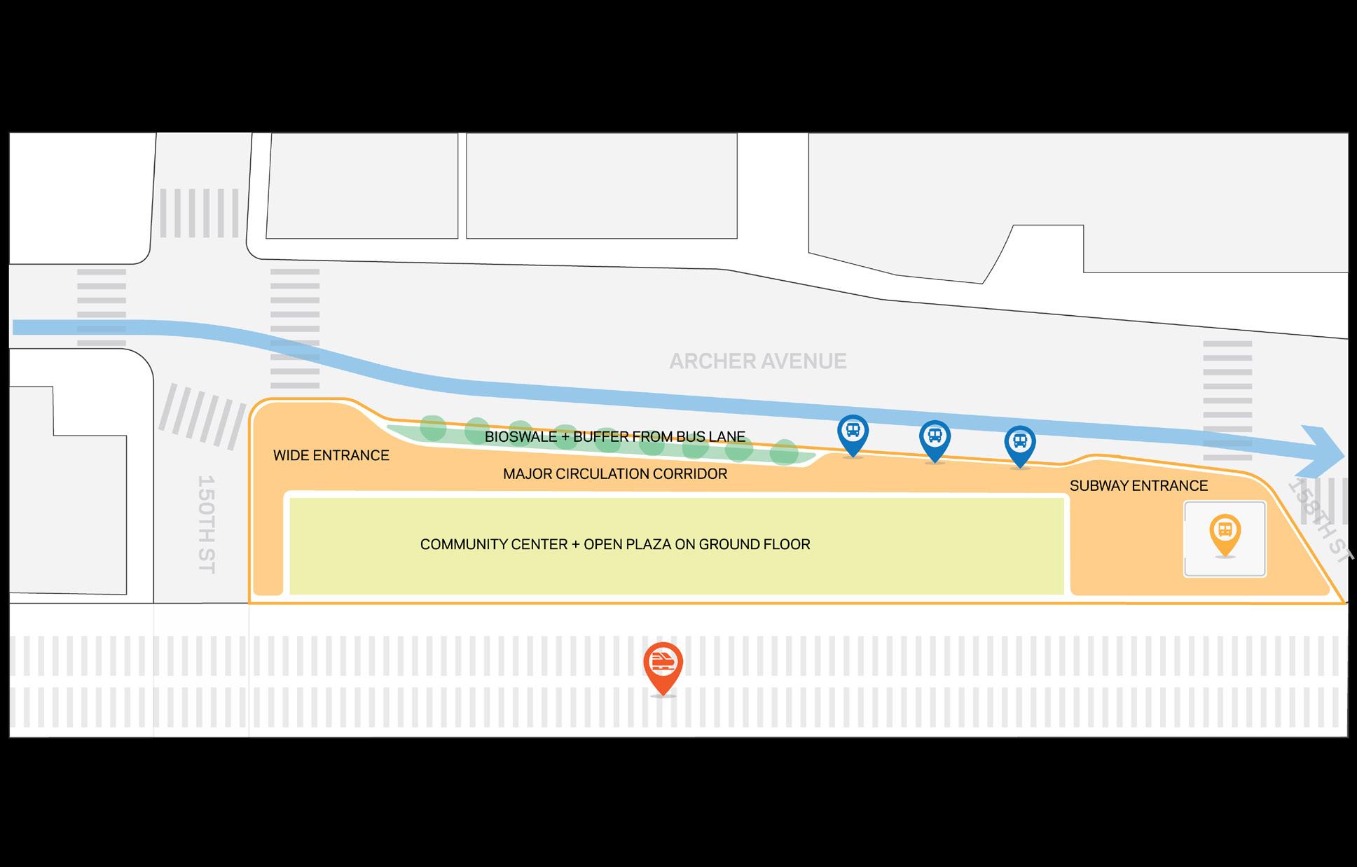 This masterplan outlines three main buckets of resiliency interventions: district-wide stormwater management, a green transit hub, and a solar microgrid. The stormwater toolkit containing rain gardens among other interventions is to serve at a multitude of locations where right-of-way construction and stormwater issues are in alignment. The green transit hub is to take place at the intersection of Archer Avenue and 150th Street, with the solar microgrid being right across in the government-owned properties.