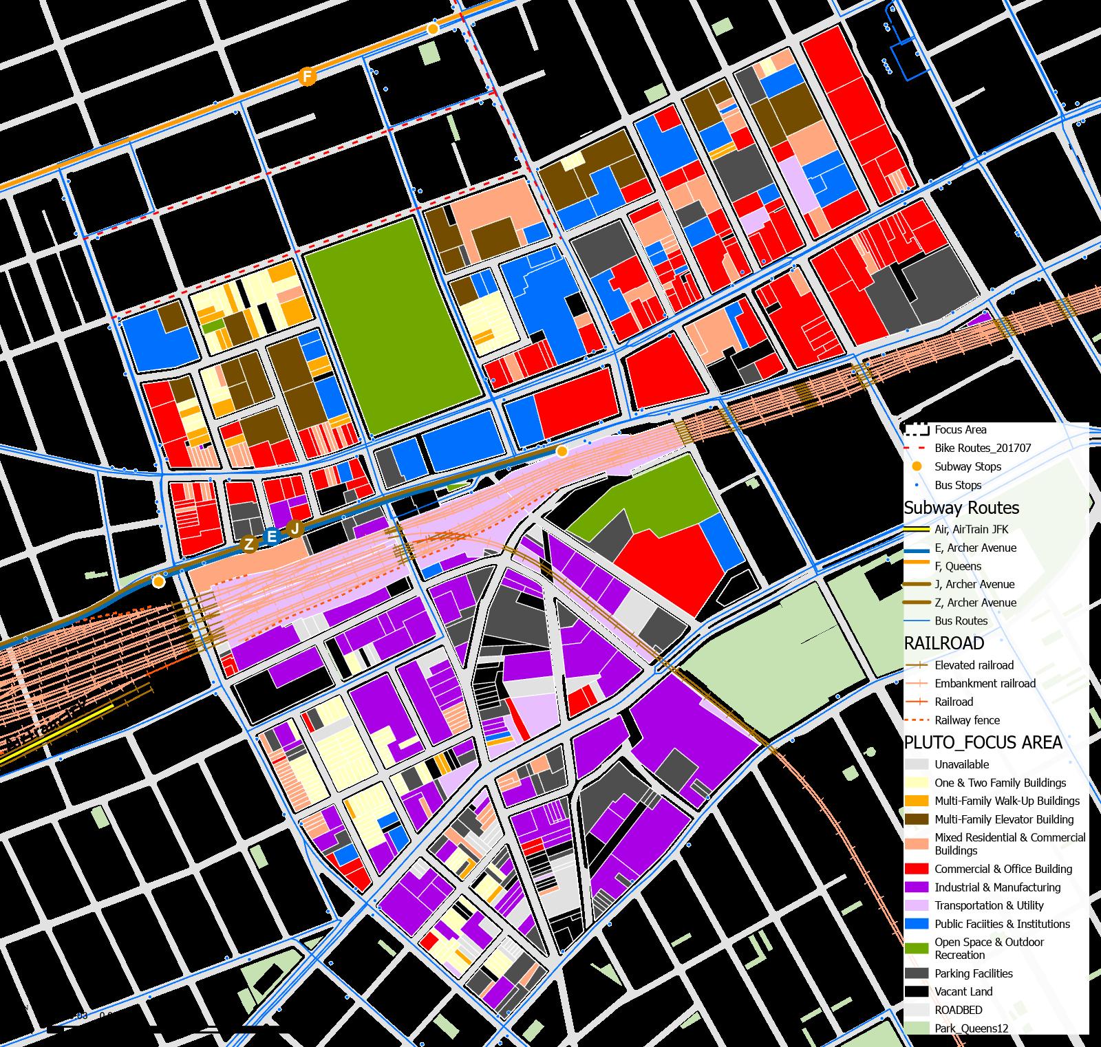In Downtown Jamaica, Queens, land use zoning displays a distinct pattern: the northern half of the downtown district, particularly along the Jamaica Avenue corridor, is predominantly occupied by Commercial & Office spaces, providing a bustling retail and business environment. This area also hosts a significant concentration of Multi Family Elevator Buildings and Public Facilities & Institutions, reflecting a dense urban mix of residential and community services. In contrast, the southern portion of Downtown Jamaica contrasts sharply, characterized mainly by Industrial & Manufacturing zones and Transportation & Utility parcels. This division highlights the area's multifaceted urban landscape, where commercial vibrancy and industrial functionality coexist, underpinned by a rich cultural tapestry and accessible transportation network, including proximity to JFK Airport and robust public transit options.