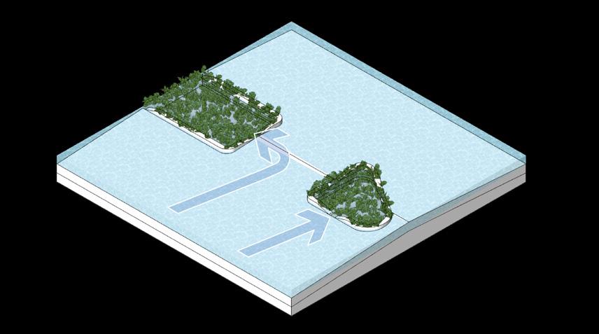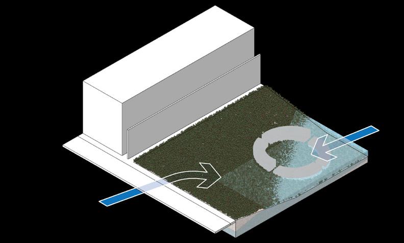 Food Waste stored degrees celcius freezer and then heated oven 40 edgrees 3-4 hour. Flies kept degree temperature and 65% humidity netted greenhouse. After 30 days the fly life cycle, black soldier flies the prepupae stage emerge from the greenhouse. These are then collected. Placed Oxen oven 60-100 degrees RSS water tanks closed aquculture systems where fish swim and feed. Minced meat placed plastic mixing tank. 2-3% industrial grade formic acid added mix. Sulphites added silage control oxidation and fungal growth chutes that travel down the building until reaching the food collection facility. 02 04 07 The dead fish collector system flushes out dead fish through bottom center drain Dead fish grinded 10-12TPH Grinder placed underneath RSS tank. pump Flour added to fish silage solidify then extruded pellets. Placed back into RSS 08 Black Solider Fly Dried Prepupae Aquaculture: Mechanics systems and Plans Building Section: Water Connection Residential Floor Plan: Living Across Scales Perspective: Public Space Above Perspective: Ground Floor Public Activation and Flood Adaptation Perspective: Ground Floor Public Activation and Flood Adaptation Ground Floor Plan: Embracing the Flood as Public Space RESIDENTIAL 75% PRIVATELY OWNED PUBLIC SPACE 10% AQUACULTURE 5% COMMUNITY 6% MAINTENANCE 4% Bedroom Bedroom Sports Barbecue Playground Tanks Pumps Plumbing Machinery Health Center Gyms Auditorium Assembly Hall Storage Solar Panels Program Breakdown Ground Floor Plan: Embracing the Flood Public Space RESIDENTIAL 75% PRIVATELY OWNED PUBLIC SPACE 10% AQUACULTURE 5% COMMUNITY 6% MAINTENANCE 4% Bedroom bedroom Bedroom Sports Gardens Barbecue Playground Tanks Pumps Plumbing Machinery Health Center Gyms Childcare Assembly Hall Storage Mechanical Solar Panels Program Breakdown Building Elevation: Void Penetration