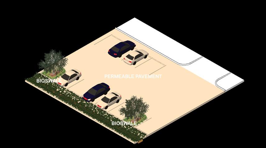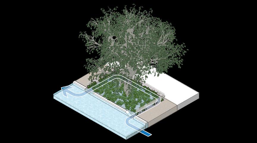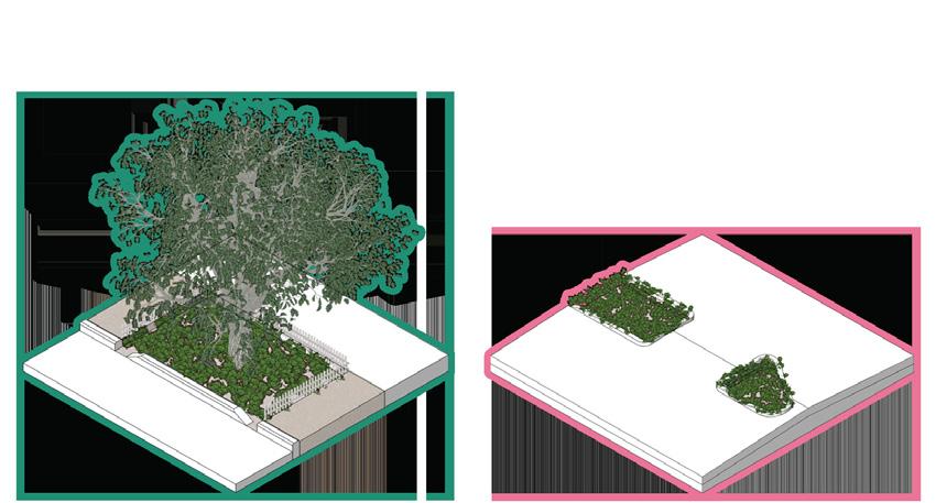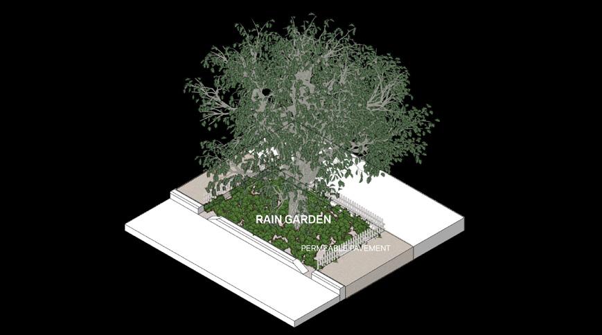 The first intervention transforms tree beds into rain gardens on curbs, managing surface water for sustainability. These gardens enhance biodiversity, augment the tree canopy, provide shade, and improve the urban pedestrian experience. This initiative marks a significant step towards fostering a more sustainable and livable urban environment.