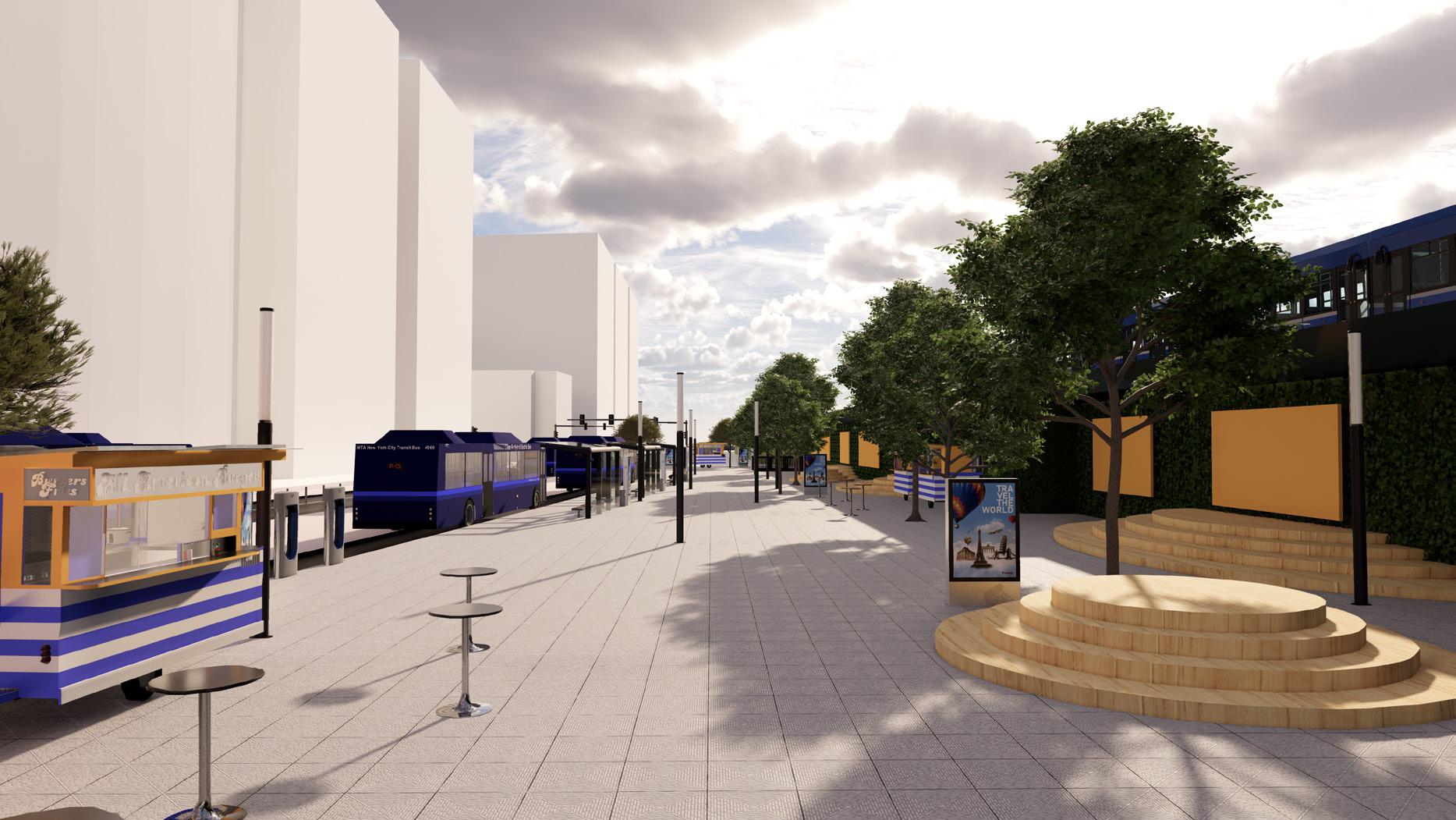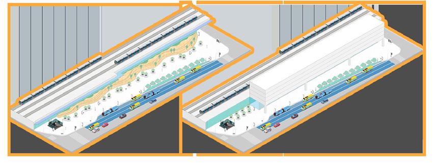 Corridor will contain over 10,000 books, 3 new educational spaces and 4 new event spaces to ensure the diverse needs of residents are met. Food trucks and market stalls also occupy these spaces so that residents can enjoy international cuisines during their breaks. The Enterprise Trading Center Aside Football Pitch Sea Square Emerald Library Canopy 2 3 4 100 200 300 Tram Line Tram Stop Two-way Street Bike Lane Collection Node Green Infrastructure Main Spine Public High density residential Parks and open space Commercial retail Office Medium density residential Low density residential Mixed-use