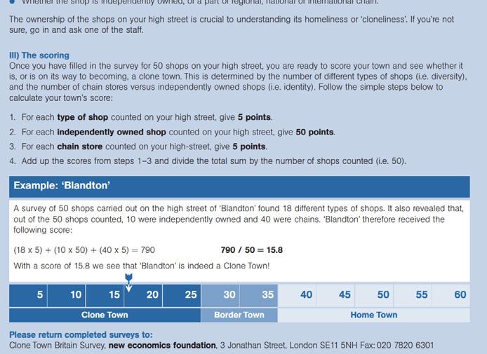 Context This paper investigates the relationship between Clone town scores and the economic, social, and environmental sustainability of six districts in London. The study pairs districts with similar socioeconomic conditions, labeling those with higher Clone town scores as Higher Clone town Score Town (HCST) and their counterparts as Lower Clone town Score Town (LCST). Over 400 surveys, 50 interviews, and ample amounts of data analysis from local databases were conducted to measure sustainability across these districts. Contrary to the New Economic Foundation's hypothesis in their Clone Town Britain Report, project findings show that LCSTs outperform HCSTs in economic vitality. Unsurprisingly HCSTs outperform their LCST counterparts in social sustainability due to strong community networks in these districts. Environmental sustainability was found to have no relationship to clone town scores. This research underscores the importance of understanding local dynamics and community engagement in promoting sustainable urban development across London's districts.