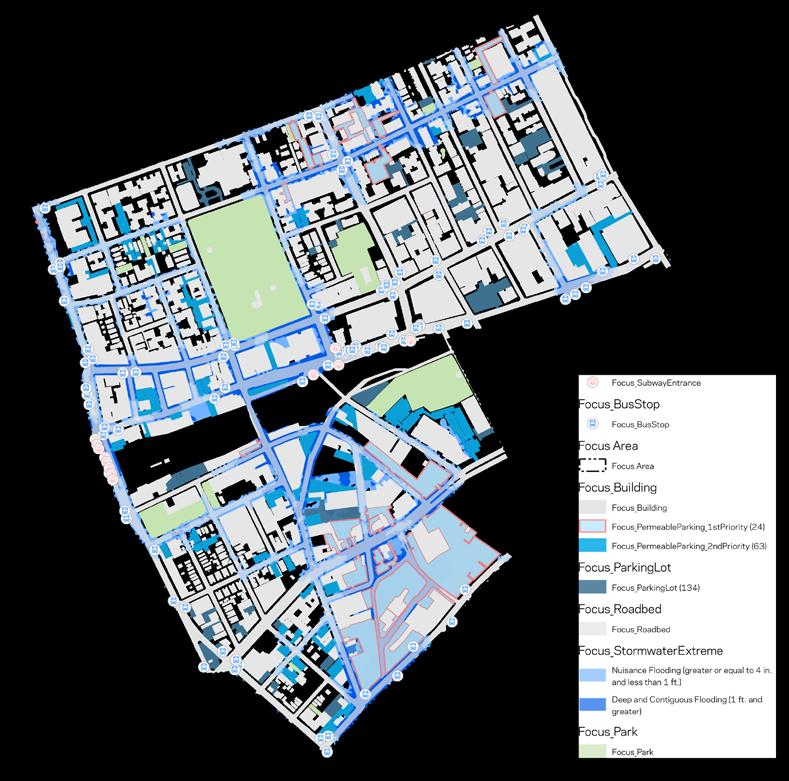 To address challenges like stormwater flooding, unsafe streets, and potential gentrification, a comprehensive approach is essential. The resilient framework focuses on climate resilience, a green transit hub, and preserving the industrial heritage.