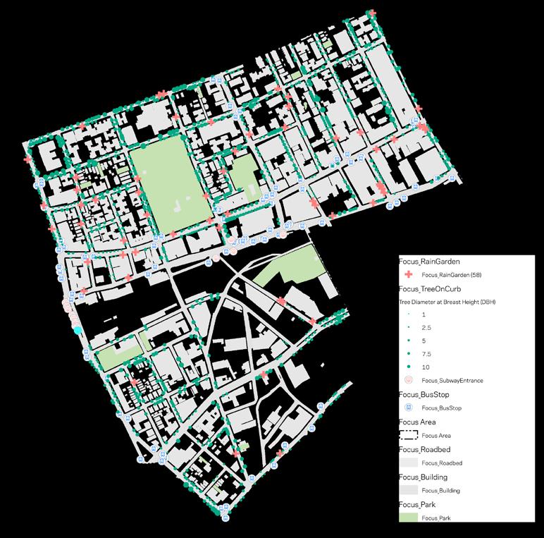 Pedestrian streets with dead tree beds on the curb will become rain gardens, marked on the map with red points. Following NYC DEP guidelines, the excavation and installation process will ensure a minimum length of 10 feet, with protective fences. These rain gardens aim to absorb and contain overflow, contributing to effective stormwater management.