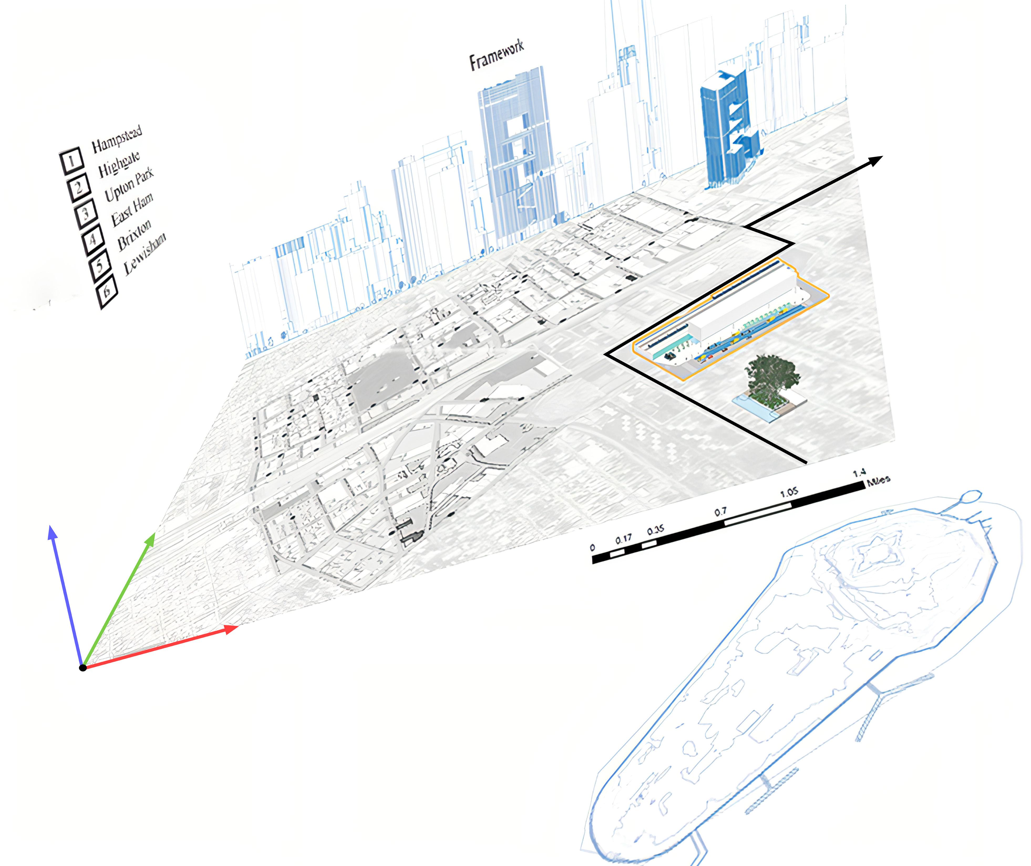 Axi Corridor is a hypothetical 22-acre site designed as an exercise in sustainable development and urban renewal. Sitting in the industrial district of Woolwich in South East London, Axi Corridor seeks to revitalize and empower a forgotten section of London whilst preserving its diversity and character. Named after its ‘axe’ shaped frame, Axi Corridor will contain an eclectic array of mixed-use buildings, affordable housing, public spaces, parks and services located in its revitalized new high street. Its combination of human scaled buildings and narrow pathways mimics that of an urban village which will benefit social cohesion and cultural mixing amongst its residents. Sitting inside a major transportation hub, Axi Corridor will be served by the DLR electric tram which runs throughout the site and will allow residents to reach Central London in under thirty minutes. This development will also contain green roofs and constructed wetlands in order to reduce the risk of urban flooding in a neighbourhood that has had devastating floods in the past.