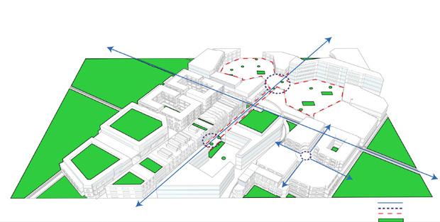 Campus The site will contain a diverse range of community centers and services in its interconnected public spaces in order to empower the greater community as well educate them on the issues of sustainability. The new Emerald library located in the Campus