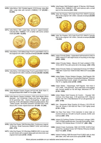 1474) India Mughal Empire Rupee AH1221/48 Shah Alam II, Sharjahanabad Mint KM#714 Fine (£40 - £60) 1475) India Mysore Dasara Exhibition 1929 Gold Medal 29mm diameter - by C.Krishniah Chetty and Sons, Bangalore, 22.35 grammes Obv : Scene of ploughing, to right, and spinning, to left, with depiction of Mysore palace above. Rev : Within wreath : MYSORE DASARA / EXHIBITION / 1929. About UNC in their original blue box (£1,000 - £1,200)