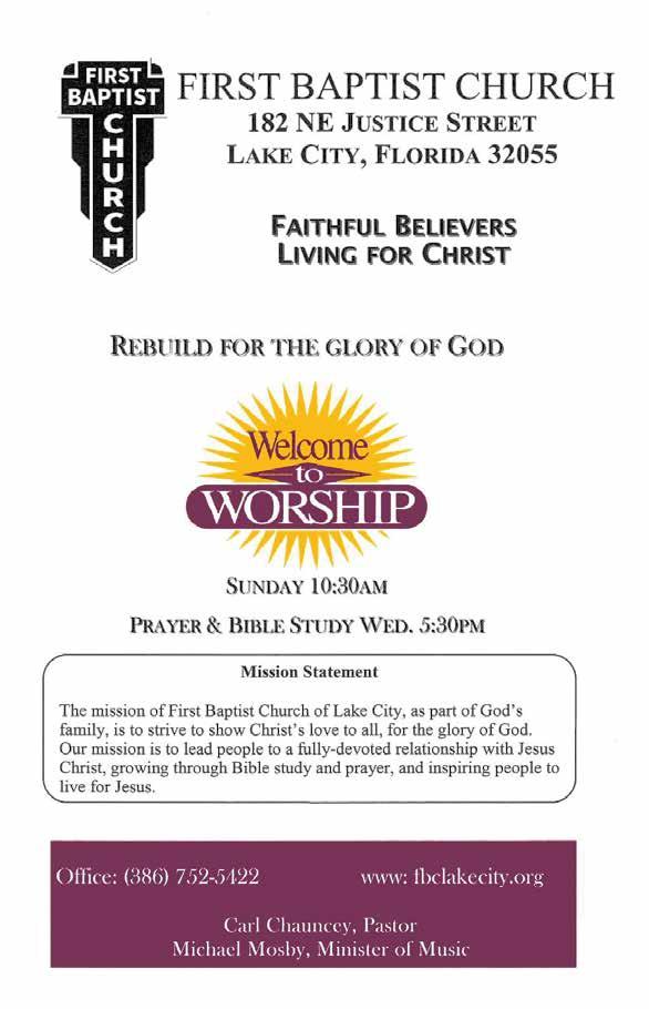 Church. Welcome to Worship. Sunday 10:30am. Pray & bible study, Wed. 5:30pm. Rebuild for the glory of God. 182 NE Justice St. Lake City FL 32055. (dis)