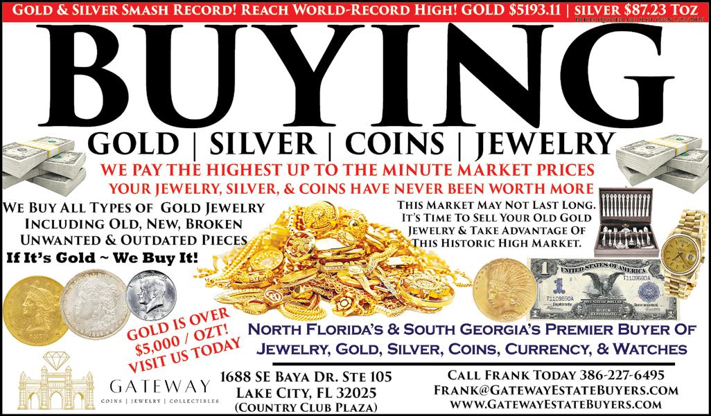Serving Lake City for 10 yrs! Top dollar paid for gold and silver jewelry, sterling silverware, diamonds, and coins, directly across from Toyota on 90. 386-965-3470. (C 12/30/26)