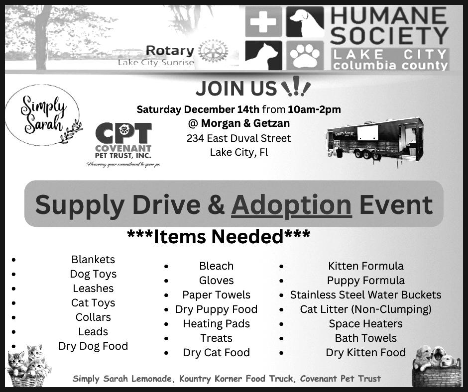 Linens, tables, chairs, yard games & much more. Everything you need for your party event. (386)288-8629 or (386)288-8708 (C 12/25)